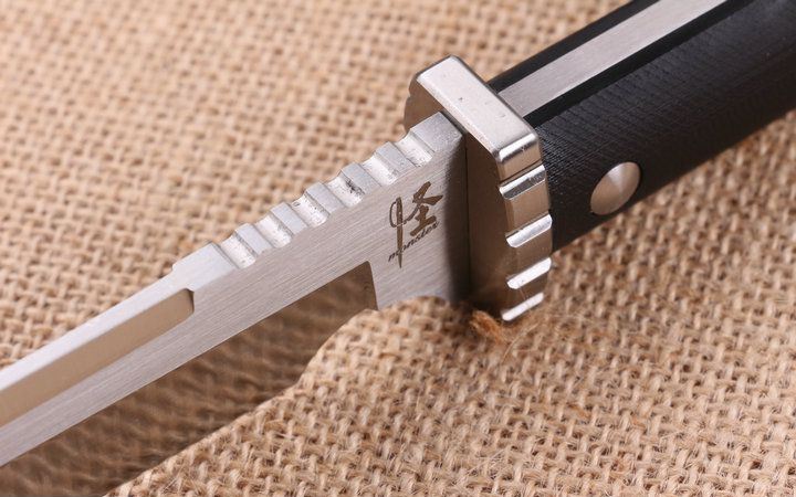 刀圣海怪直刀 全 长:27.0cm 刃 长:15cm 柄 长:12.0cm 刃 宽:3.0cm 刃 厚:5.0mm 刃 材:9CR8MOV 重 量:520g(含包装) 硬 度: 60HRC 表 面:精细沙光 柄 材:刀身一体龙骨,黑色G10+方型加厚钢头 锁 型:直锁