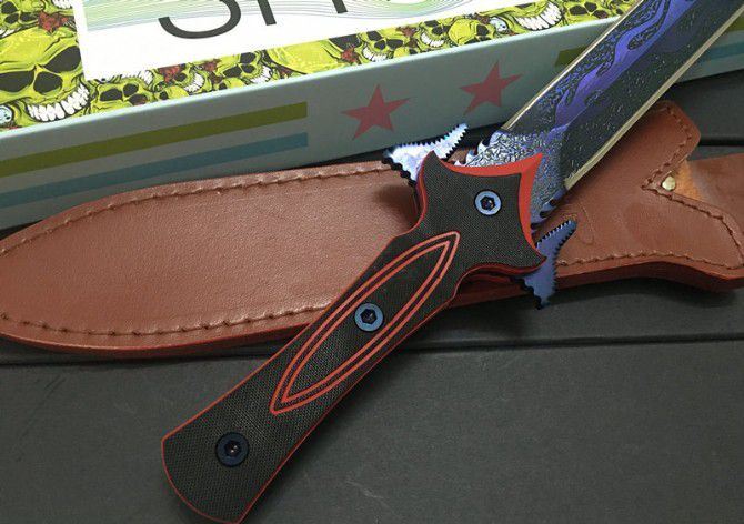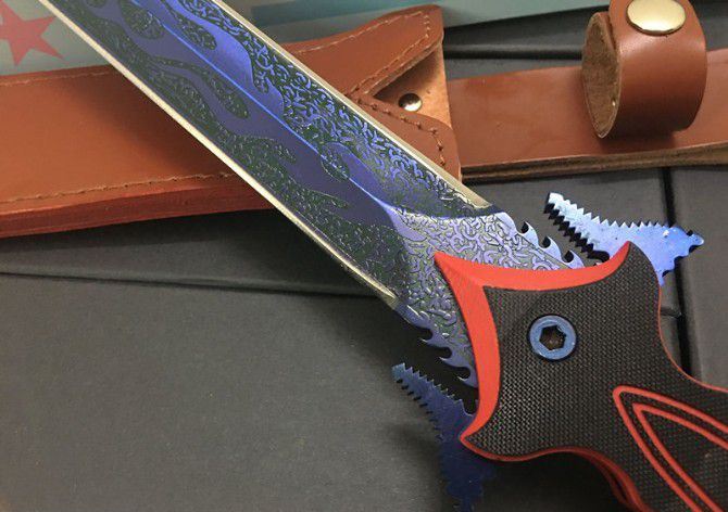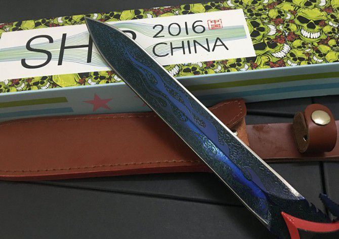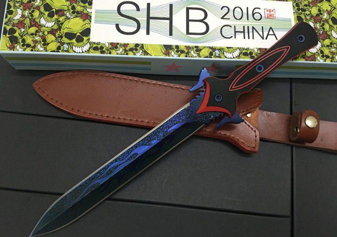 午夜蓝魔双锋战刀 全长:41cm 刃长:29cm 柄长:16.5cm 刃厚:3mm 刃宽:3.4cm 刃材:5Cr15 柄材:塑料柄 硬度:57HRC 净重:600克 毛重:1000克 表面处理:蓝钛花纹