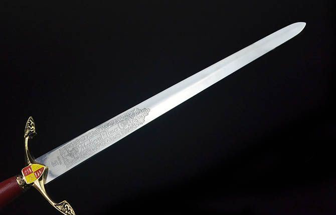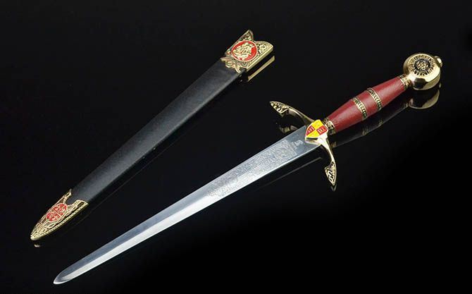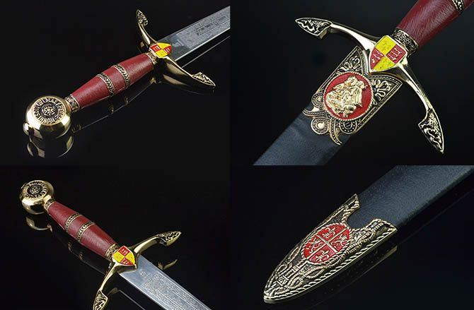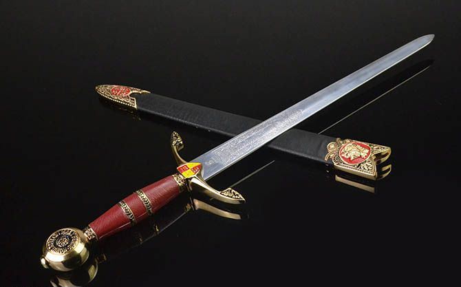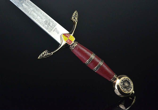 西班牙王子短剑(未开锋) 剑身长:28 柄 长:13.5 剑身宽:2.8(最宽处) 刃 厚:0.27 刃 材:420 硬 度:54HRC 柄 材:雕花合金,仿皮手把 刀 鞘:合金雕花、裹皮鞘 剑身表面:镜光雕刻 重 量:500克(含鞘) 其 他:未开锋