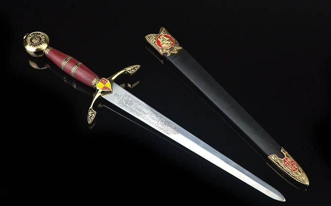 西班牙王子短剑(未开锋) 剑身长:28 柄 长:13.5 剑身宽:2.8(最宽处) 刃 厚:0.27 刃 材:420 硬 度:54HRC 柄 材:雕花合金,仿皮手把 刀 鞘:合金雕花、裹皮鞘 剑身表面:镜光雕刻 重 量:500克(含鞘)