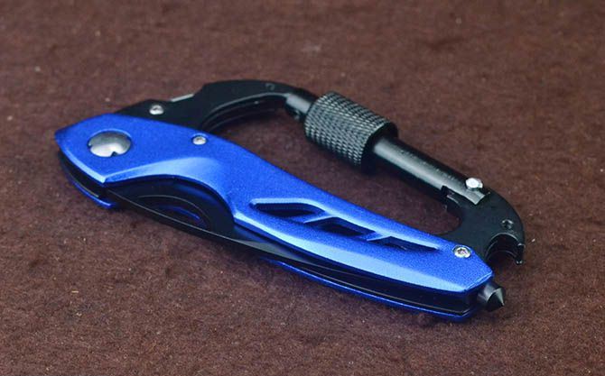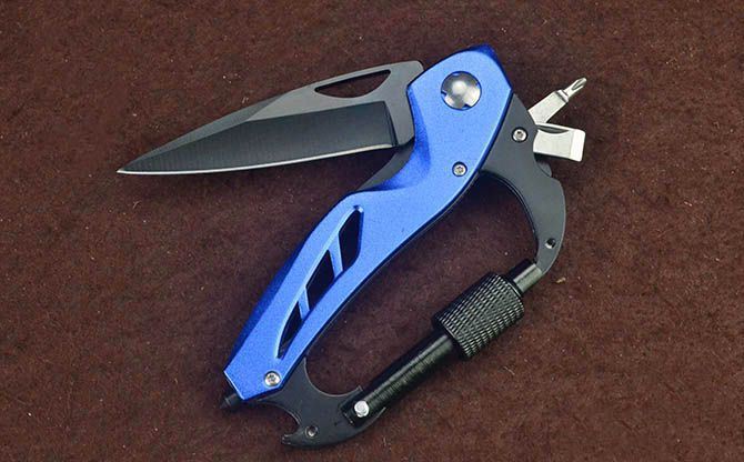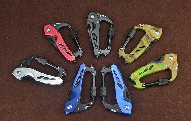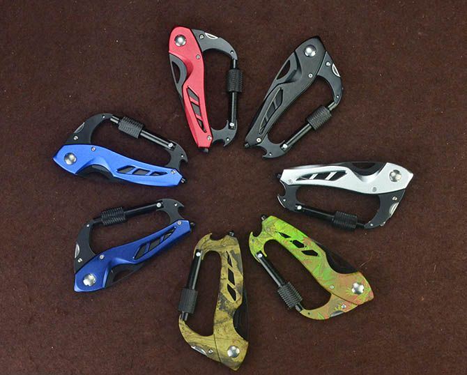 多功能登山扣折刀(多色) 刃材:440 硬度: 54HRC 全长:19CM 刃长:7CM 刃厚: 0.27CM 刃宽:2.3CM (最宽处) 柄长: 11CM 涂层:黑色/蓝色/深蓝/红色/银色/迷彩/枫叶 柄材: 铝柄 重量:92克 锁定: 线锁
