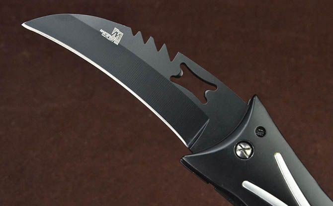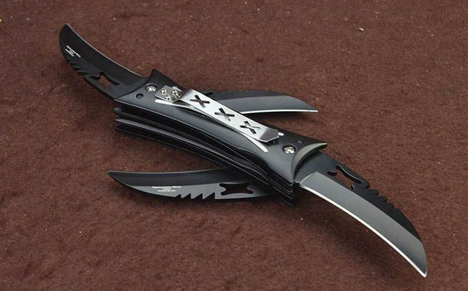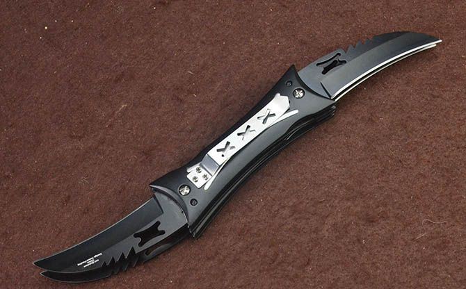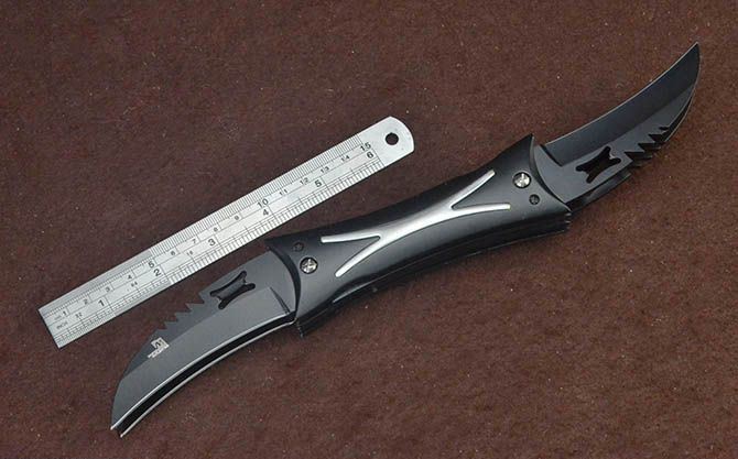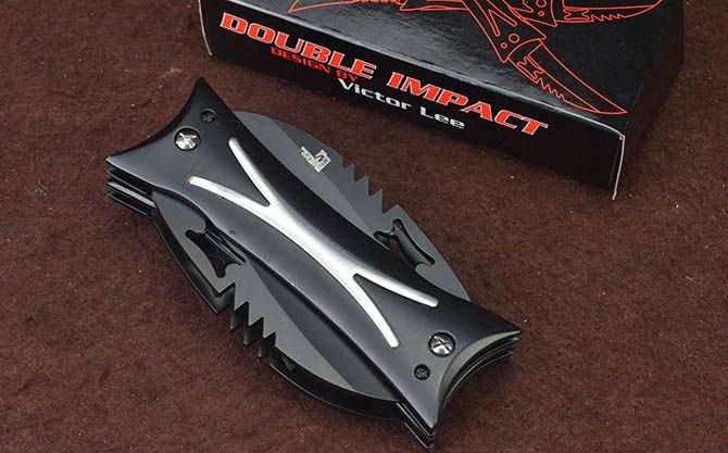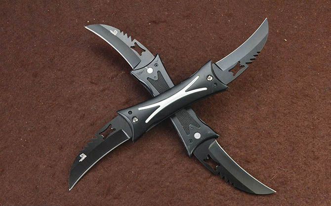 X4双层分体多刃折刀(4刃) 全 长:28cm 刃 长:8cm 柄 长:11.5cm 刃 宽:2.8cm 刃 厚:2.8mm 刃 材:5Cr13Mov 重 量:321g (含包装) 硬 度:58HRC 表 面:发黑 柄 材:钢+铝柄 锁 闭:线锁