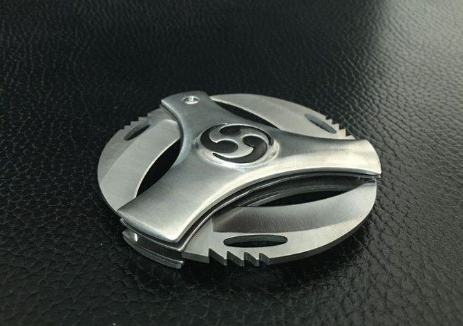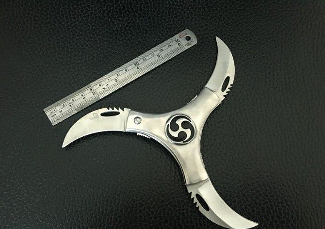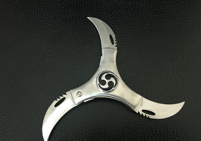单层带双小飞镖风火轮 直 径:10.0cm 刃 长:5.5cm 刃 厚:3.0mm 刃 材:440 硬 度:56HRC 刀 柄:不锈钢 表 面:砂光 锁定方式:侧锁 重 量:300克(含包装) 备 注:带双小飞镖