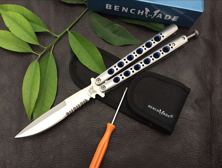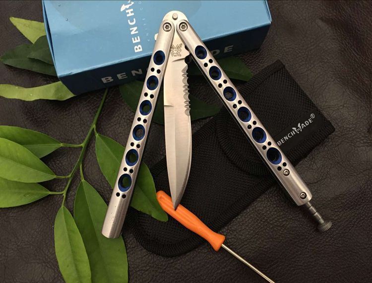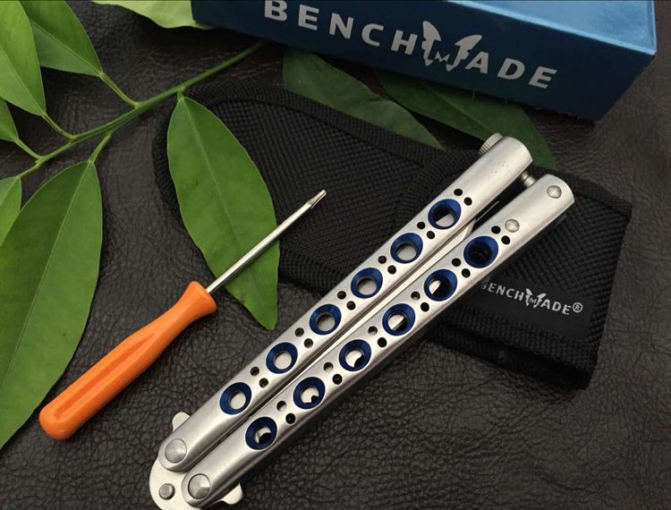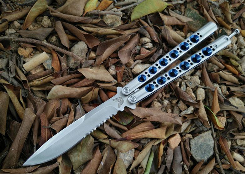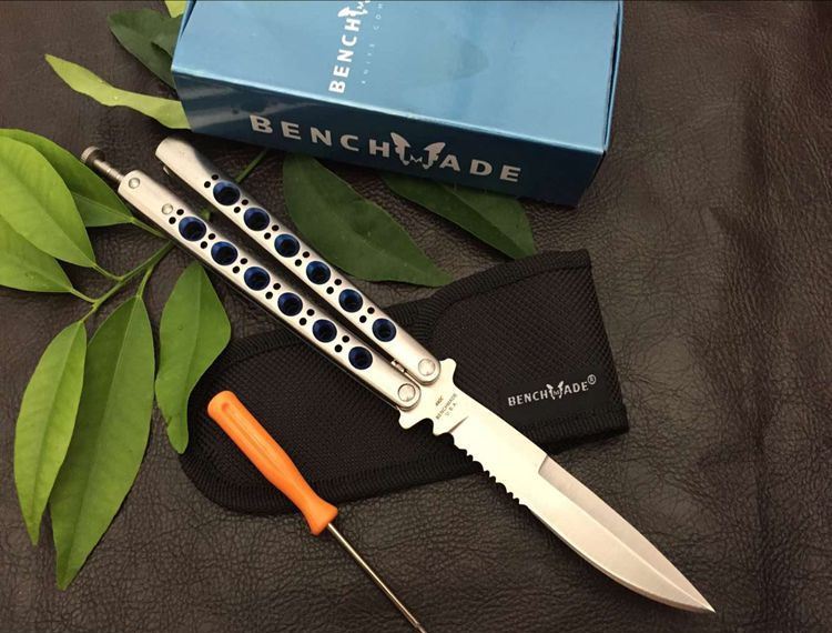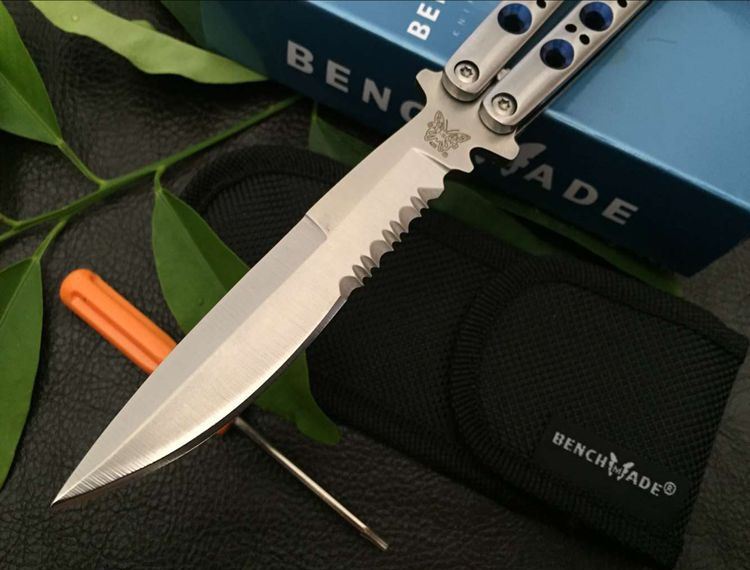 经典the one BM42S甩刀(蓝版) 全长:23.8CM 刃长:9.5CM 刃厚:0.3CM 刃材料:440C 刃硬度:58 柄材料:不锈钢压铸 柄硬度:40 重量:150克 刀鞘 高级尼龙套,可横竖挂皮带 the one款Benchmade- BM43,The one (唯一)精工打造,bowie博弈型刃,一体 柄型更坚固和耐摔,转动灵活,由THE ONE 出品,不可多得的精品甩刀