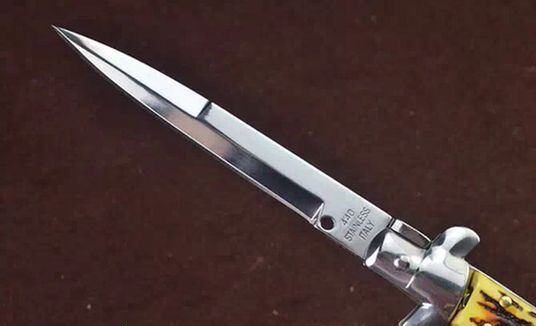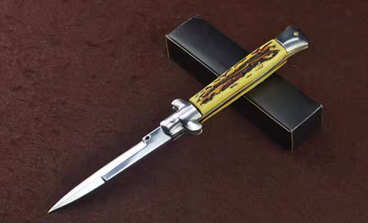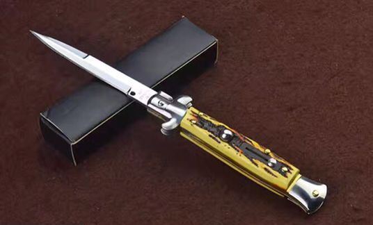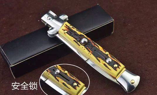 枪刺刃的黑手党侧跳,力克柄,弹力超强,锁定到位,刃镜面,带有保险装置,刀护手处暗藏闭合开关,出口产品,质量保证!满足把玩和收藏需要