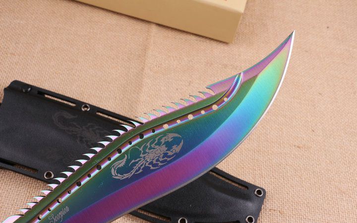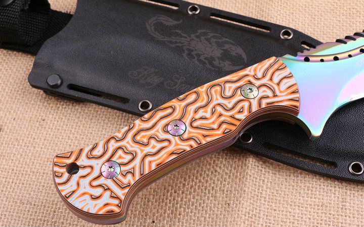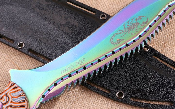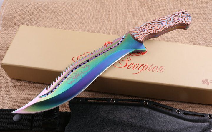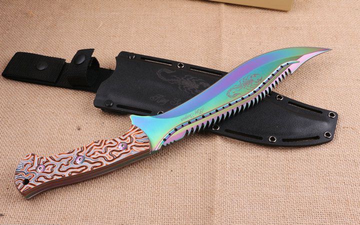 彩钛版蝎子王狗腿刀 全 长:39cm 刃 长:25cm 柄 长:14.2cm 刃 宽:4.9cm(最宽处) 刃 厚:6.2mm 刃 材:5CR13MOV 硬 度:58HRC 刀 柄:图案G10手柄,可以防滑 表 面:镀钛金 重 量:1100克(含包装)