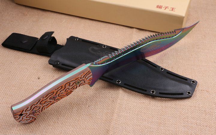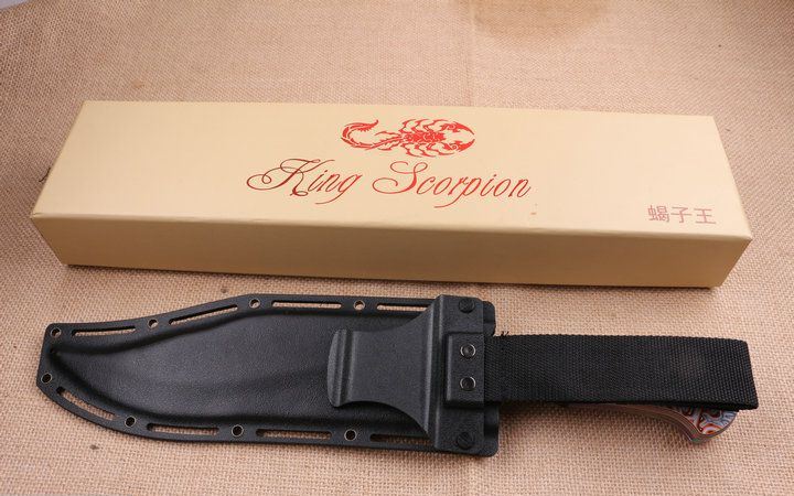 彩钛版蝎子王狗腿刀 全 长:39cm 刃 长:25cm 柄 长:14.2cm 刃 宽:4.9cm(最宽处) 刃 厚:6.2mm 刃 材:5CR13MOV 硬 度:58HRC 刀 柄:图案G10手柄,可以防滑 表 面:镀钛金 重 量:1100克(含包装) 备 注:原厂彩盒,优质K鞘