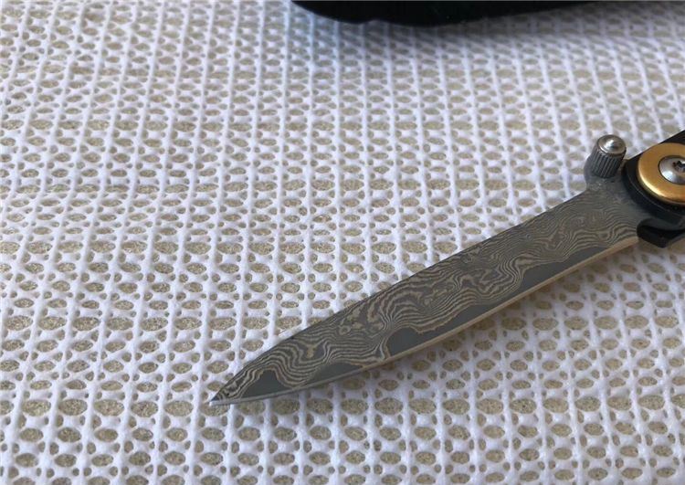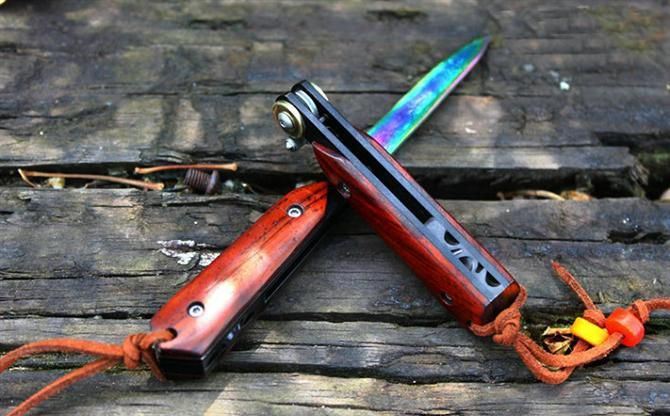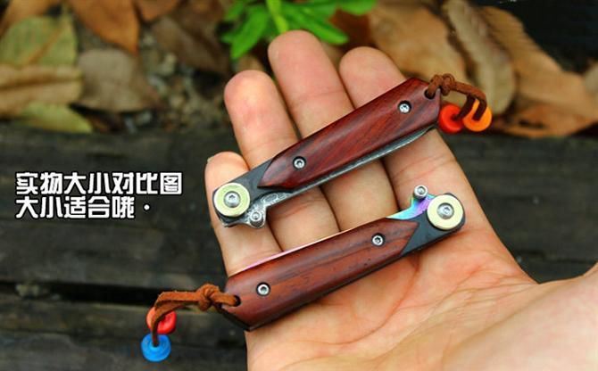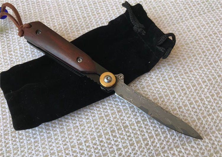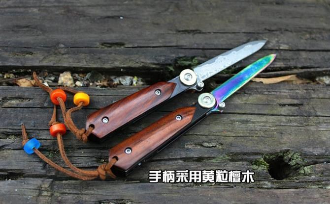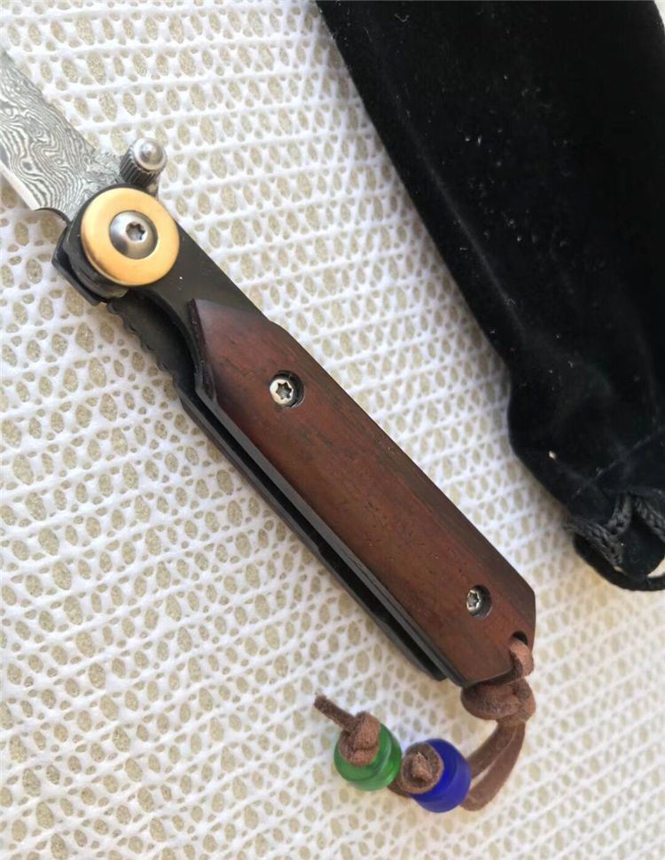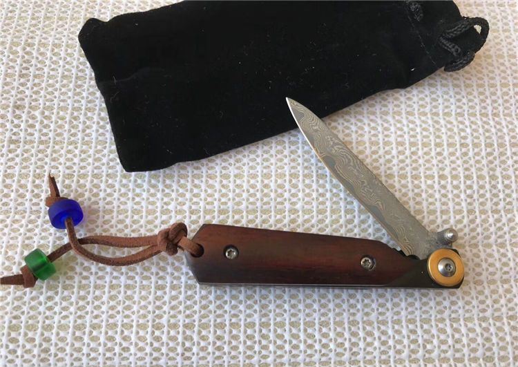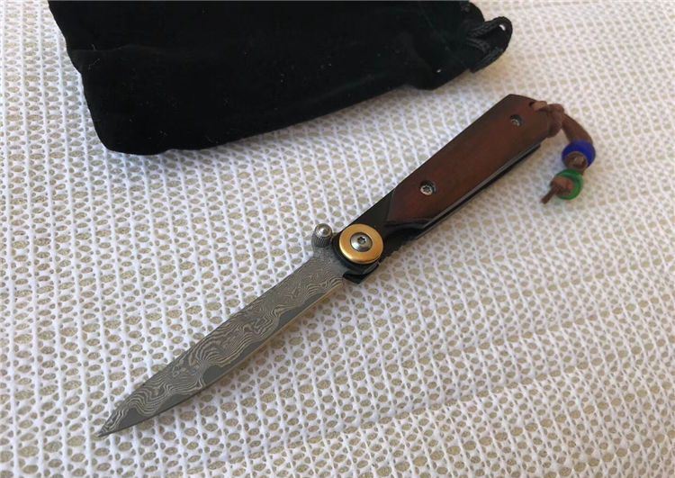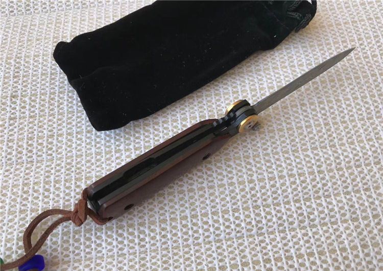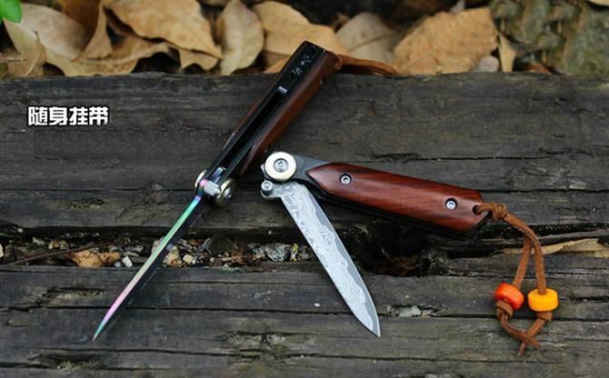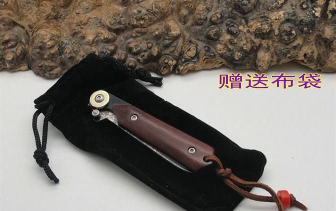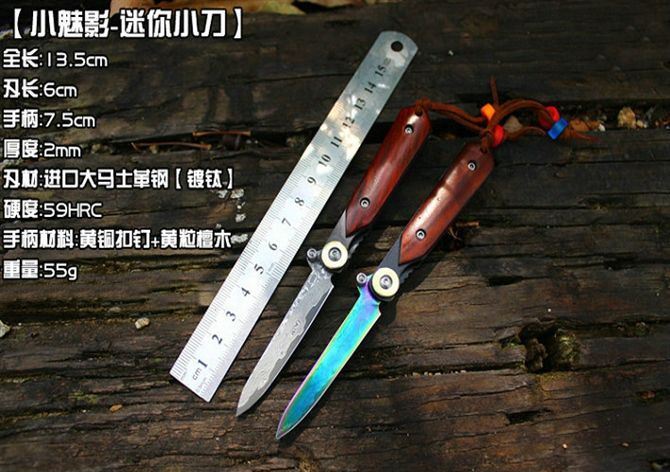小魅影大马士革钢折刀(原色、彩钛色) 全长:13.5CM 刃长:6CM 刀柄:7.5CM 厚度:2MM 刃材:进口大马士革钢(镀钛) 硬度:59HRC 柄材:黄铜扣钉+黄粒檀木 重量:55g