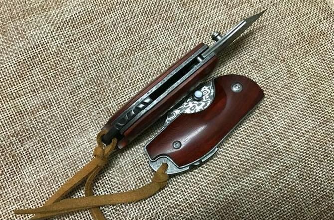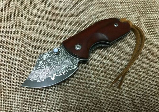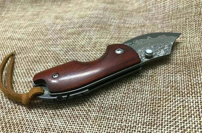 新版小犀牛大马士革折刀 全 长: 11.5cm 刃 长: 5cm 柄 长: 6.5cm 硬 度: 59-60HRC 刃 厚: 0.27cm 重 量: 80克 表 面: 纯手工制造 柄 材: 微粒黄檀