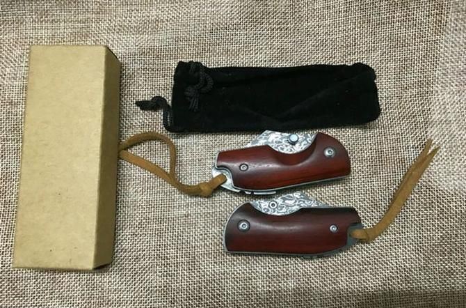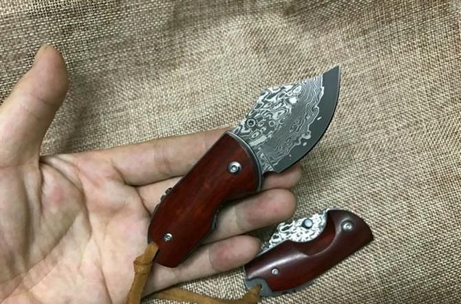 新版小犀牛大马士革折刀 全 长: 11.5cm 刃 长: 5cm 柄 长: 6.5cm 硬 度: 59-60HRC 刃 厚: 0.27cm 重 量: 80克 表 面: 纯手工制造 柄 材: 微粒黄檀 刃 材: 大马士革钢 刀刃纹路各异,以实物为准