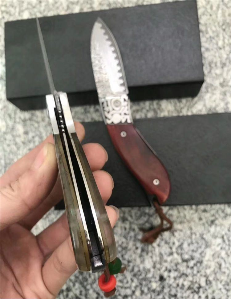 全 长: 16cm 刃 长: 6.5cm 柄 长: 9.5cm 硬 度: 59-60HRC 刃 厚: 0.21cm 重 量: 150克含包装 表 面: 纯手工制造 柄 材: 彩贝 刃 材: 大马士革钢 刀刃纹路各异,以实物为准