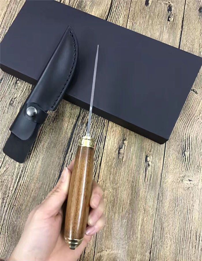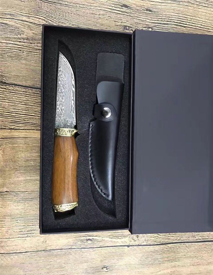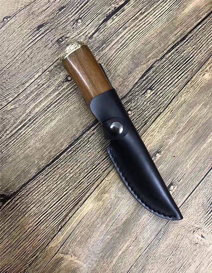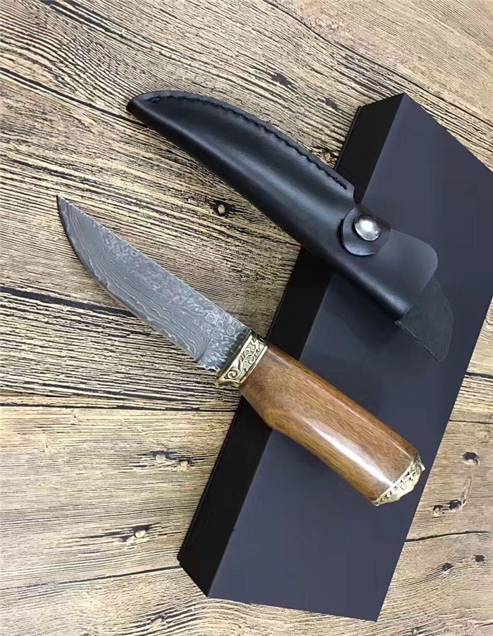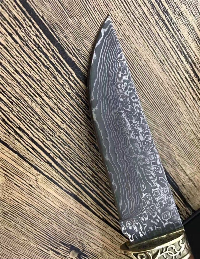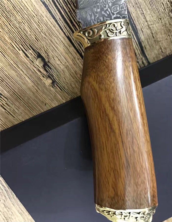俄罗斯双铜头雕花大马士革直刀 全 长:230mm 刃 长:112mm 柄 长:118mm 刃 宽:30mm 刃 厚:2.3mm 刃 材:大马士革 重 量:220g(含包装) 硬 度:58HRC 表 面:大马士革原纹 柄 材:双铜头黄铜雕+酸枝木 锁 型:定锁 其 他:配牛皮套