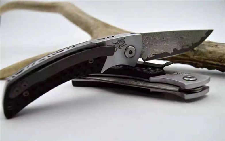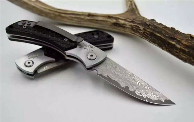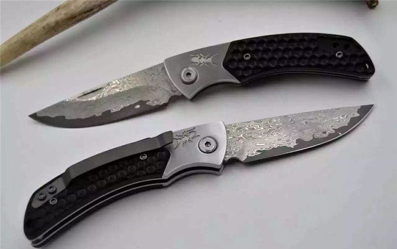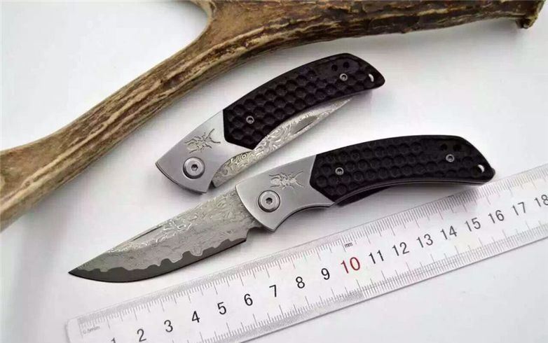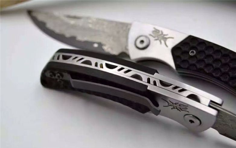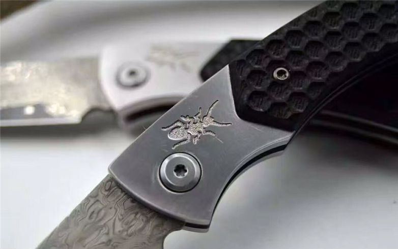 大马士革蚂蚁折刀 刃材:夹钢大马士革(芯层为VG-10) 硬度:59~60 柄材:紫光檀即黑檀(木材表面精雕蜂窝纹) 打开总长:16CM 刃厚:0.21MM 刃长:6.8CM 刃宽:2CM(最宽处) 柄长:9.2CM