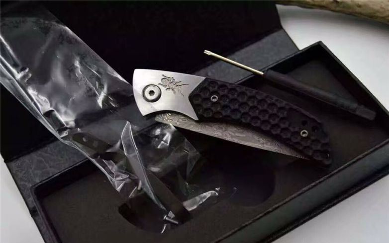 大马士革蚂蚁折刀 刃材:夹钢大马士革(芯层为VG-10) 硬度:59~60 柄材:紫光檀即黑檀(木材表面精雕蜂窝纹) 打开总长:16CM 刃厚:0.21MM 刃长:6.8CM 刃宽:2CM(最宽处) 柄长:9.2CM 配置:礼盒+皮套