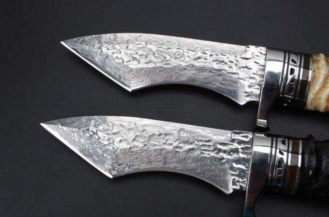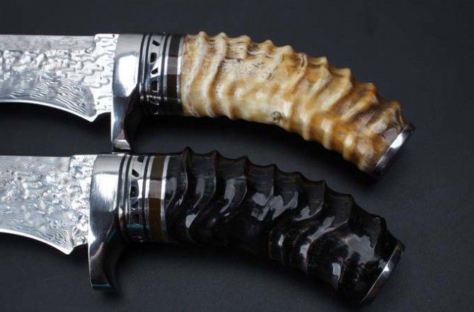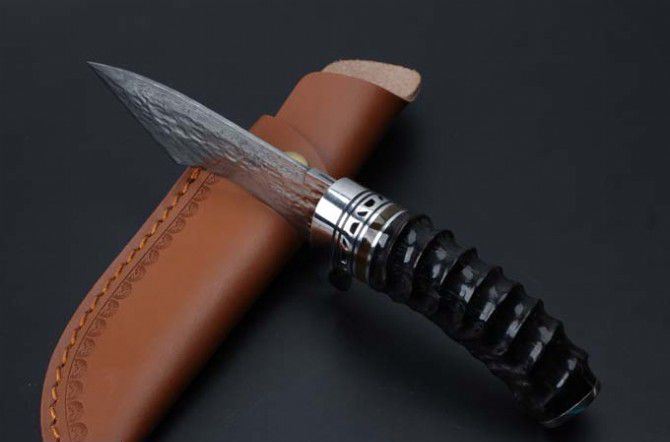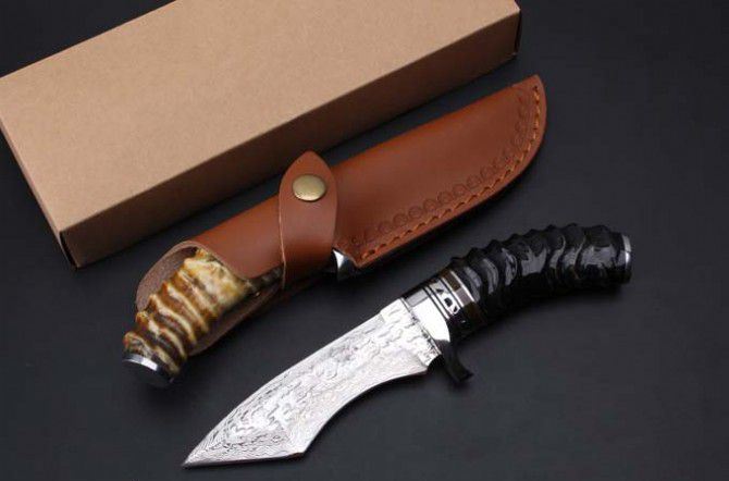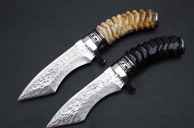 大马士革骑士黄羊角猎刀 全 长: 22.8cm 刃 长: 12.1cm 柄 长: 10.8cm 刃 宽: 3.5cm(最宽处) 硬 度: 59HRC 刃 厚: 0.4cm 柄 材: 野生黄羊角 重 量: 342克含包装 刃 材: 雪花纹手工锻打大马士革钢 表 面: 大马士革雪花纹镶白钢