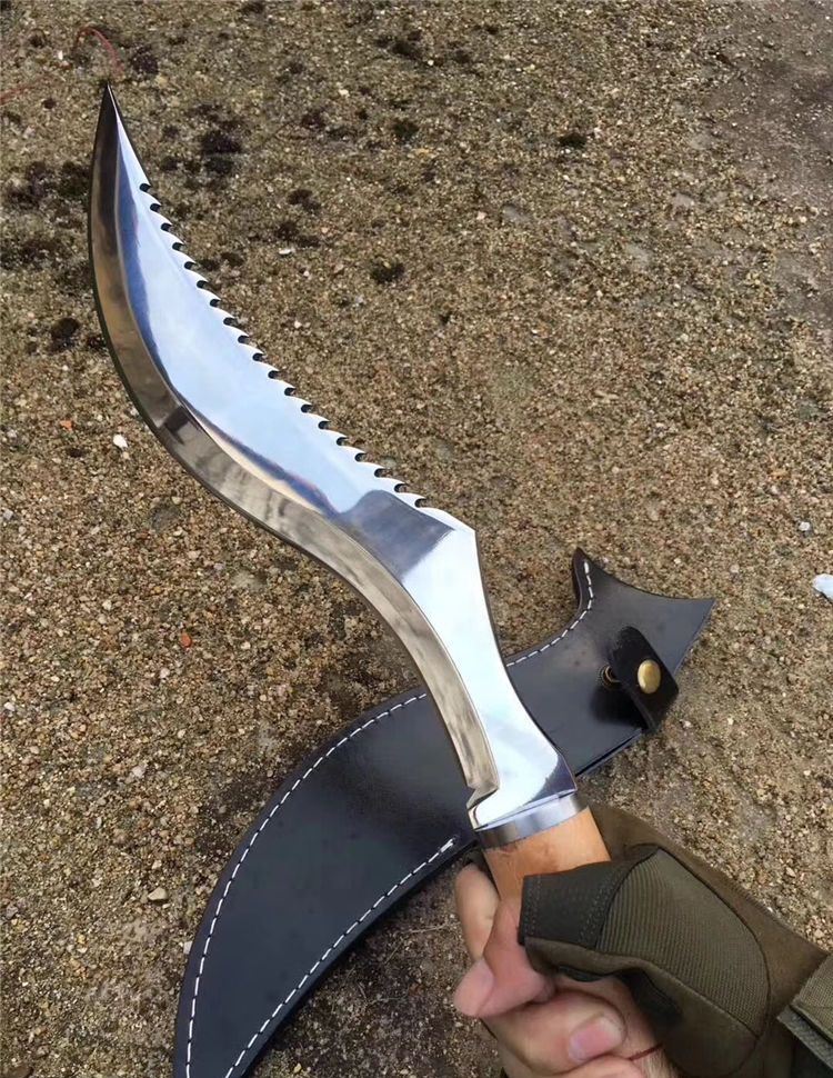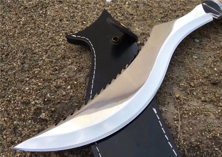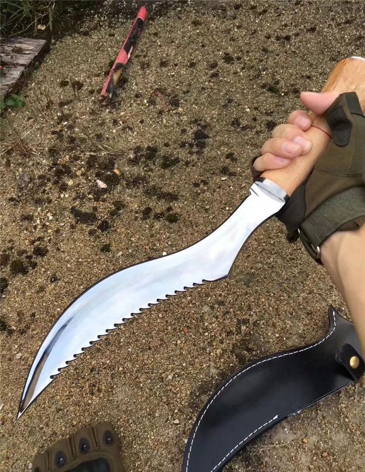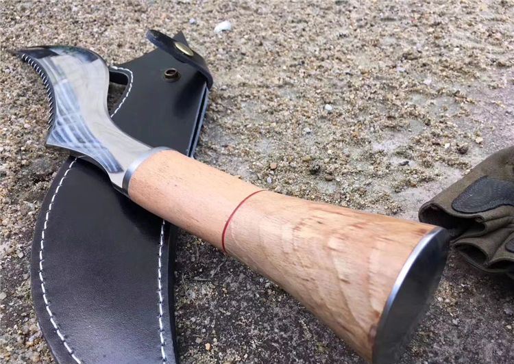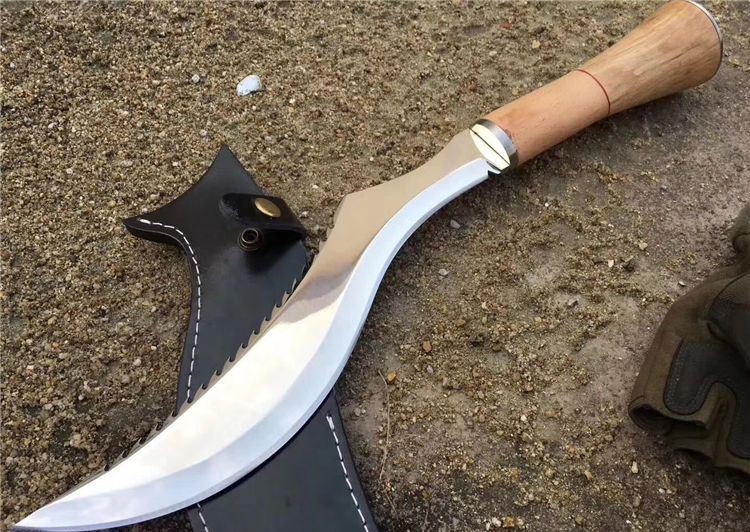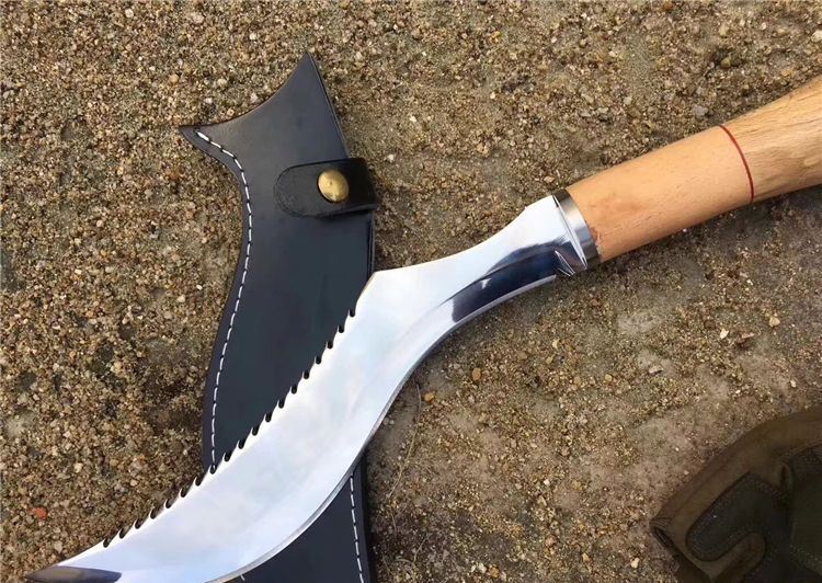 魔蝎镜光猛将狗腿刀 全 长:455mm 刃 长:320mm 柄 长:150mm 刃最宽:50mm 刃 厚:5.5mm 刃 材:8cr18mov 重 量:916g(含包装) 硬 度:59HRC 表 面:砂光 柄 材:钢一体柄+黑檀木 锁 型:定锁 其 他:配皮套+皮纸