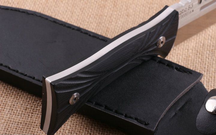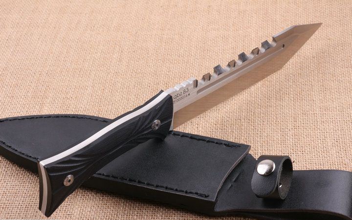 野战狼美式战术刀(T头) 全 长:34.3cm 刃 长:210cm 柄 长:12.3cm 刃 宽:4.4cm 刃 厚:5.5mm 刃 材:8CR18MOV 重 量:926g(含包装) 硬 度: 58HRC 表 面:拉丝+沙光。 柄 材:刀身一体龙骨,黑色G10 锁 型:直锁 其 他:礼品盒+皮套