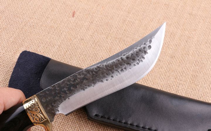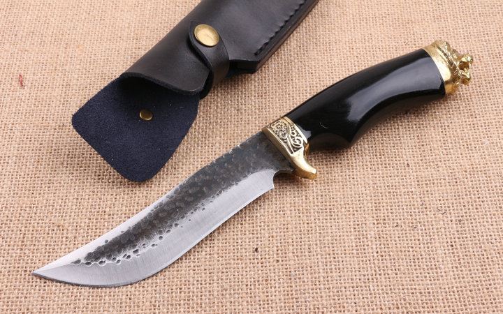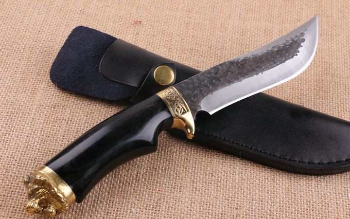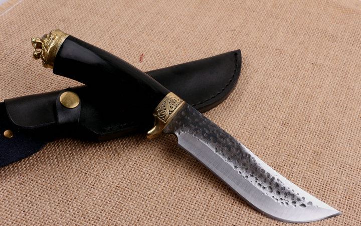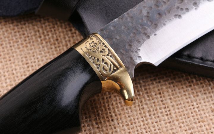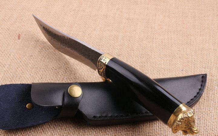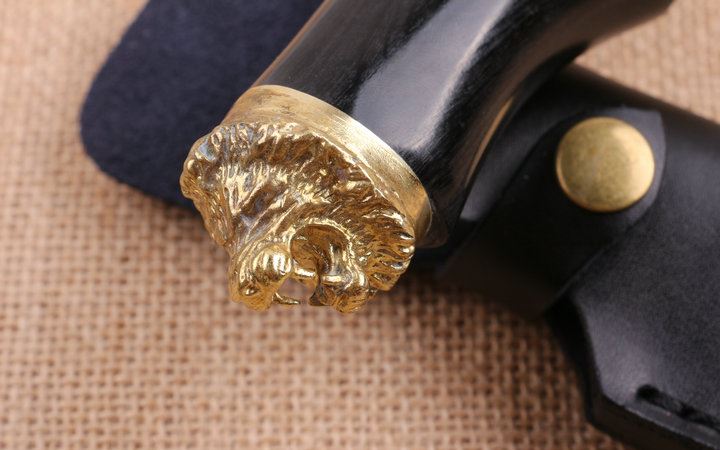 狮王锻打直刀 全长:28.0cm 刃长:14.3cm 刃厚:4.1mm 刃材:锻打钢 刀重:265g 总重:320g 表面:沙光锻打原有花纹 硬度:58-60HRC 柄材:图案铜头护手+天然黑檀木 包装:真皮套套