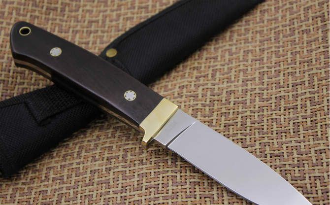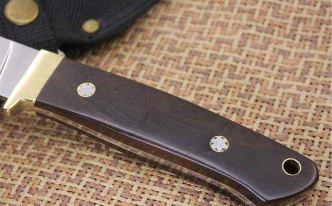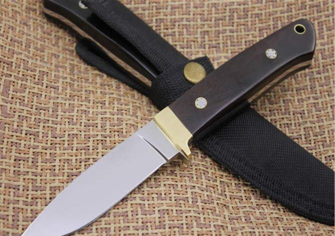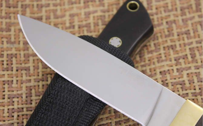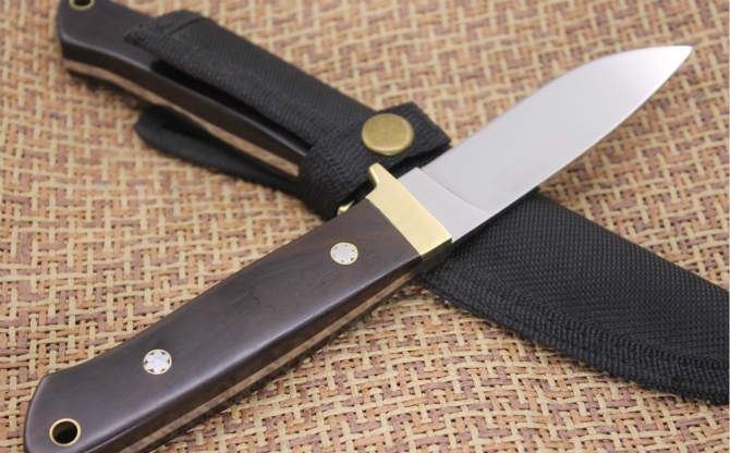 超镜光彪马直刀 全长:21CM 刃长:9.2CM 刃厚:40MM 硬度:57 刃材:5Cr13Wov 表面:超镜光 柄材:黑木柄 其他:尼龙套