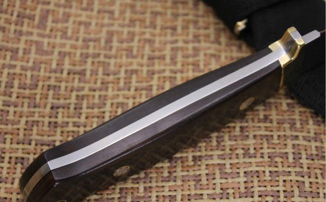 超镜光彪马直刀 全长:21CM 刃长:9.2CM 刃厚:40MM 硬度:57 刃材:5Cr13Wov 表面:超镜光 柄材:黑木柄