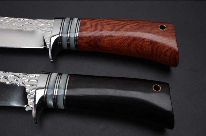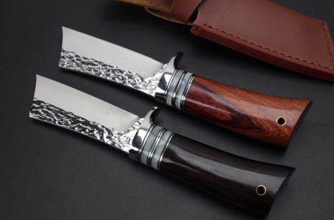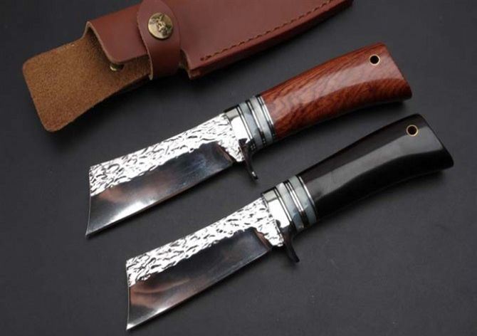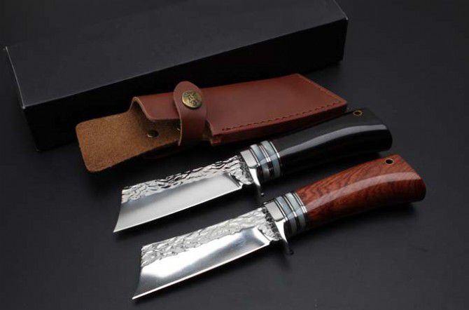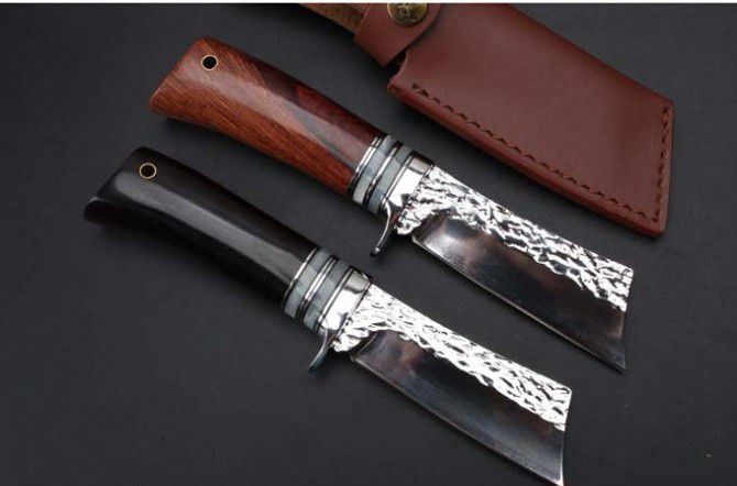 小武士锻打手工刀黑檀木、红酸枝 全 长: 22.5cm 刃 长: 9.8cm 刃 宽: 3.5cm 刃 厚: 4mm 柄 长: 10cm 刃 材: 9CR18MOV(锻打) 硬 度: 58-60HRC 净 重: 130g 总 重: 160克(含皮套) 表 面: 大马士革花纹 柄 材: 黑檀木和红酸枝两种