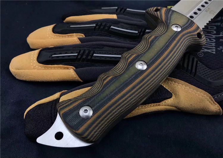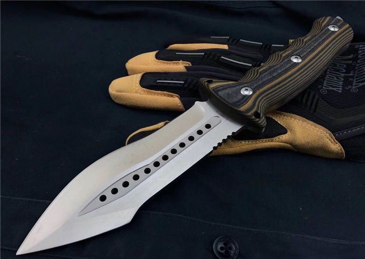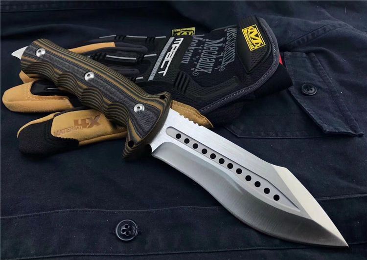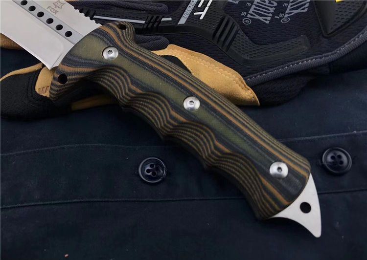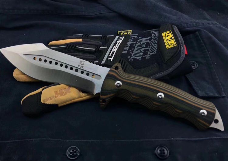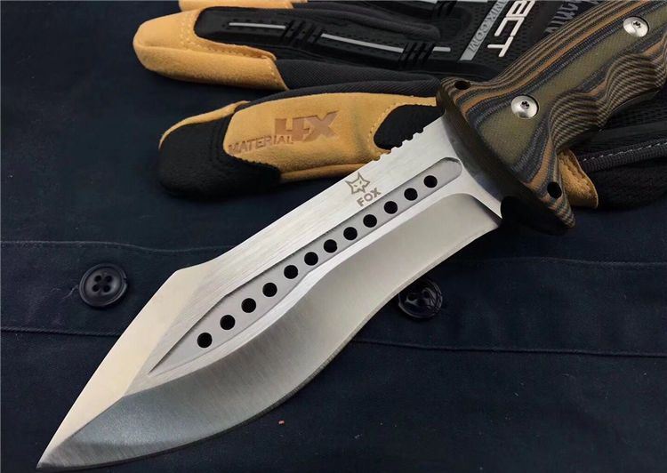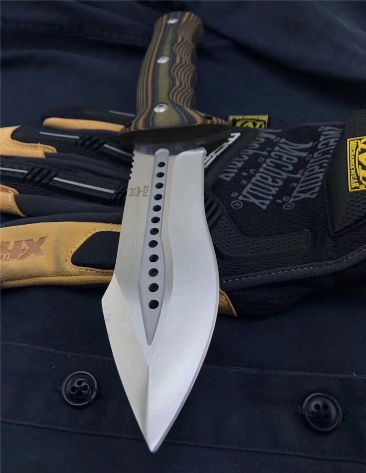 狐狸FOX千眼直刀 全长:28.3cm 刃长:14.1cm 柄长:14.2cm 刃厚:0.45cm 刃宽:4.6cm 刃材:8CR18MOV 柄材:双色G10 硬度:58HRC 净重:560克(含包装) 锁定:直锁 表面处:沙光 其他:礼品盒和优质皮套