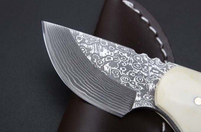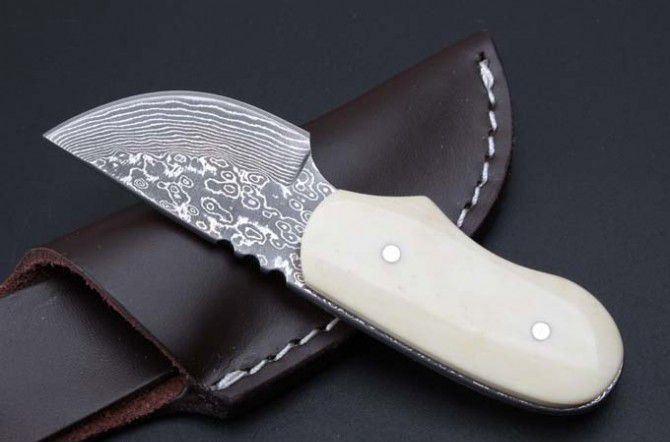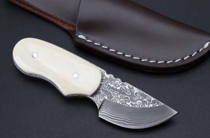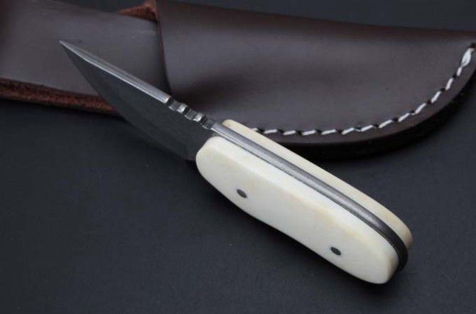 兽骨柄大马士革迷你小匕首 全 长:103mm 刃 长:45mm 柄 长:53mm 刃 宽:25mm 刃 厚:2.6mm 刃 材:大马士革 重 量:70g(含包装) 硬 度:58HRC 表 面:大马士革原纹 柄 材:一体钢+兽骨 锁 型:定锁 其 他:配牛皮套