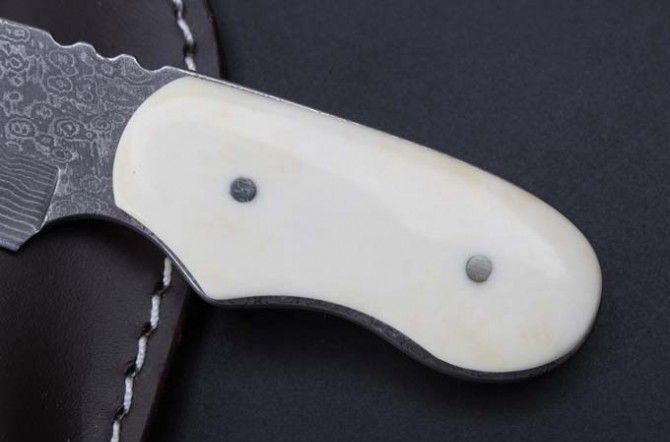 兽骨柄大马士革迷你小匕首 全 长:103mm 刃 长:45mm 柄 长:53mm 刃 宽:25mm 刃 厚:2.6mm 刃 材:大马士革 重 量:70g(含包装) 硬 度:58HRC 表 面:大马士革原纹 柄 材:一体钢+兽骨 锁 型:定锁