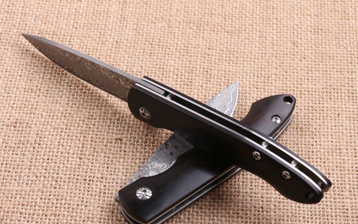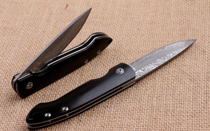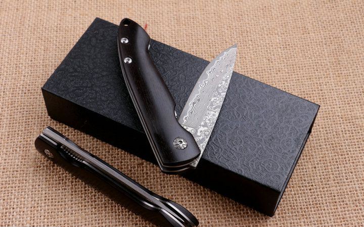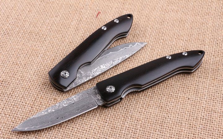大马士革黑美人折刀 全长:19.8cm 刀刃:8.2cm 刃厚:0.29cm 刃宽:2.2cm 柄长:11.5cm 硬度:58HRC 净重:160g 材料:VG10大马士革钢 柄材:钢片+天然黑檀木 锁型:线锁 包装;黑色礼品盒