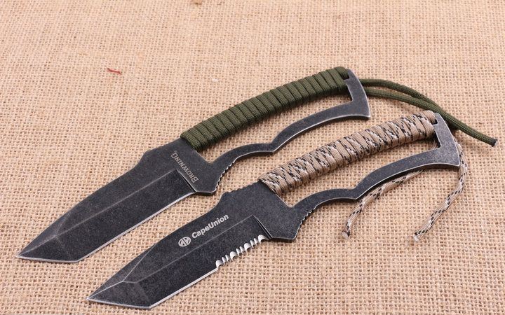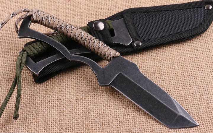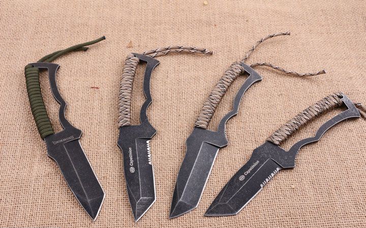 黑魂鲸沙直刀 全长:21.5cm 刀刃:11cm 刃厚:0.29cm 刃宽:3.0cm 柄长:10.5cm 硬度:58HRC 净重:160g 材料:5CR15MOV 柄材:一休龙骨,内绕1.1米迷彩绳了,可以受230KG力,户外必备 锁型:直锁 表面:全刀石洗纹,半齿和全刃两款任选
