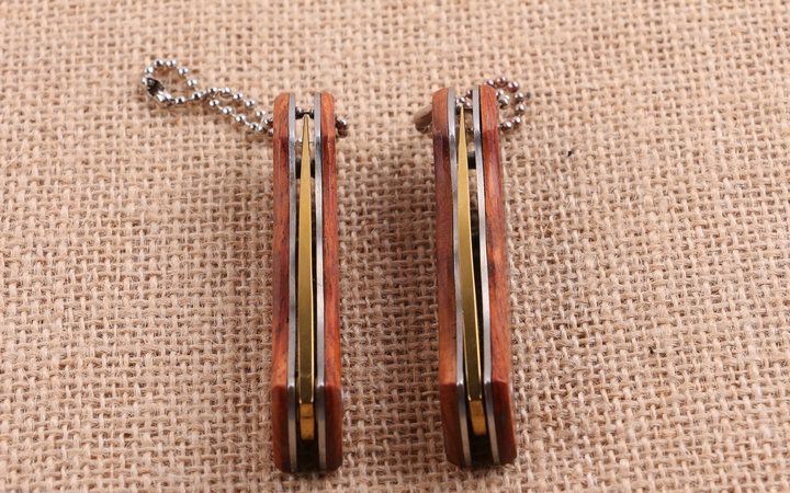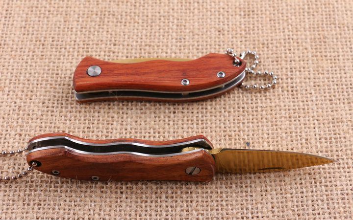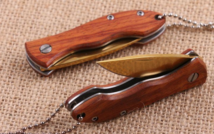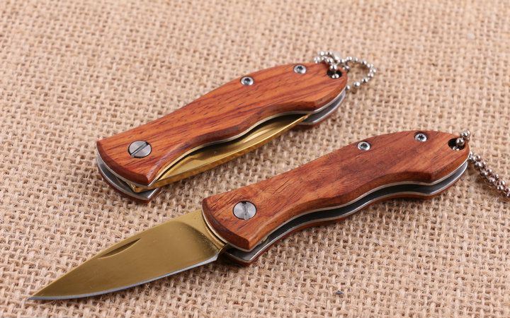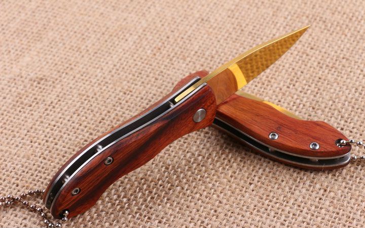 小金枝叶折刀 全长:12.6cm 刃长:5.5cm 柄长:7.6cm 刃厚:0.26cm 刃宽:1.6cm 刃材:5CR15MOV 柄材:花梨木 硬度:57HRC 净重;45克(含包装) 锁定:无锁 表面处:钛金