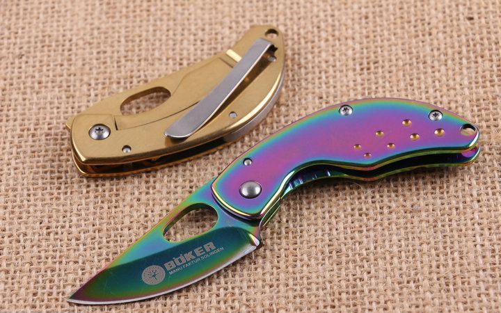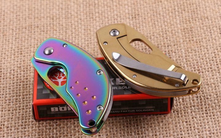 博克F87小折刀彩钛、金色 全长:12.5cm 刃长:5.1cm 柄长:7.5cm 刃厚:0.25cm 刃宽:2.8cm 刃材:440C 柄材:全负 硬度:57HRC 净重:70克(含包装) 锁定:线锁