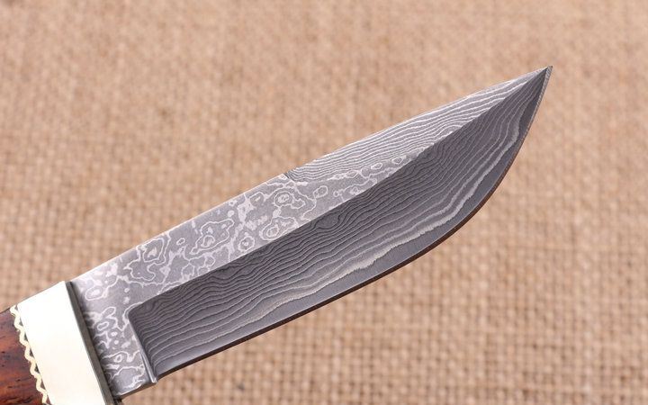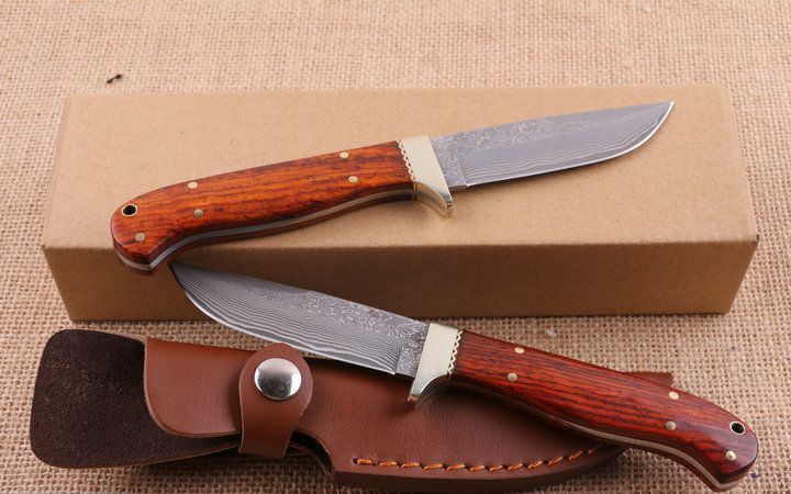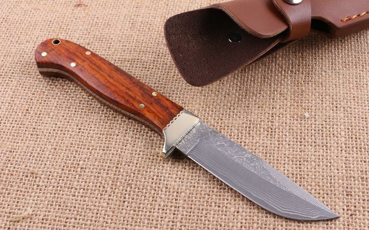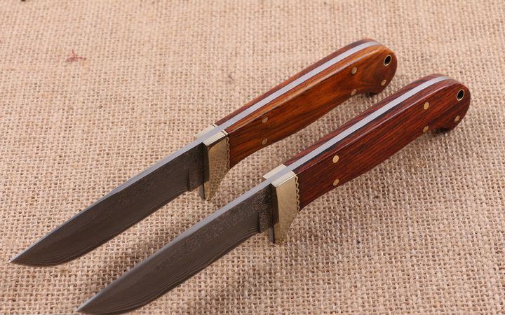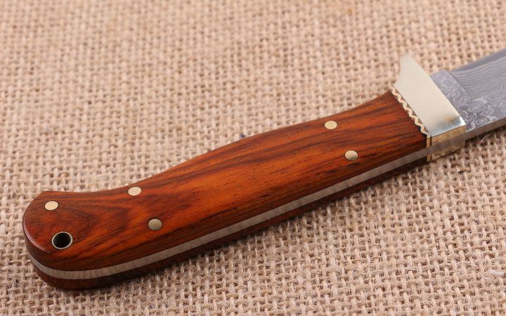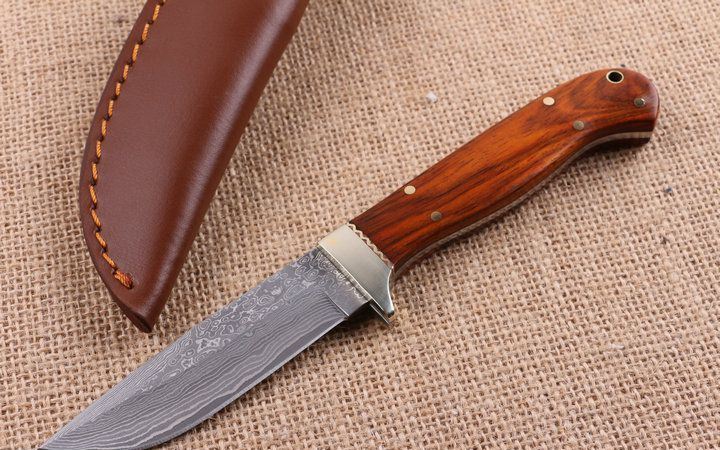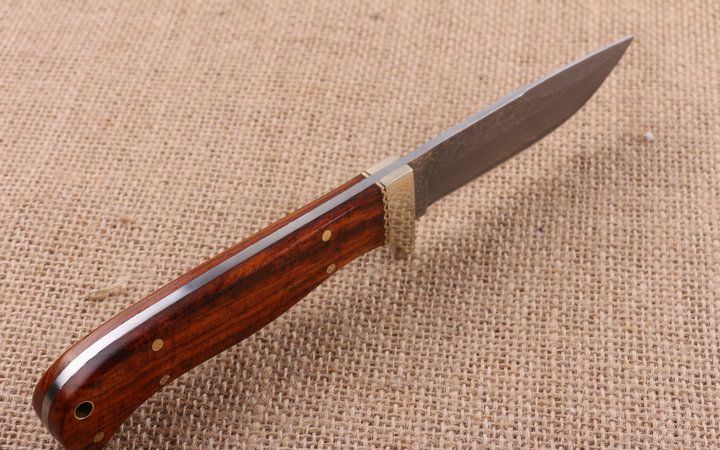 大马士革狼刺直刀收藏版 全长;20.5cm 刃长:9.2cm 柄长:11.2cm 刃厚:0.29cm 刃宽:2.5cm 刃材:VG10大马士革钢 柄材:一体龙骨刀身,两边夹红花梨木+白铜 硬度:58HRC 净重:200克(含包装) 锁定:直锁 表面处:原有大马士革花纹