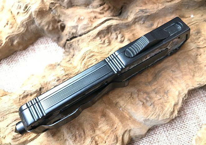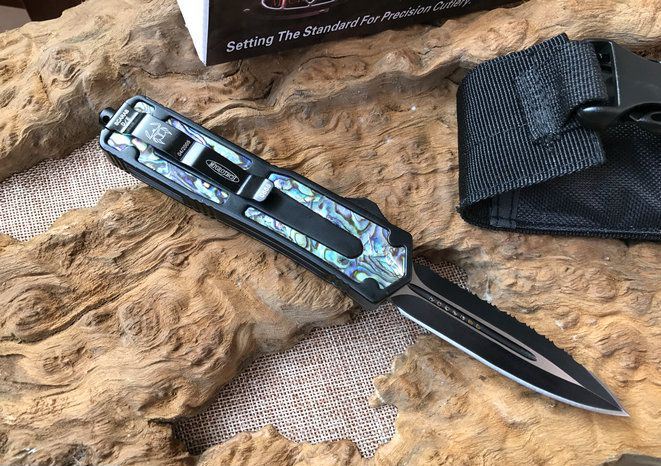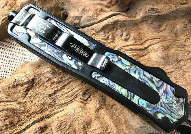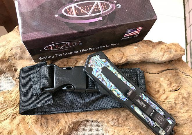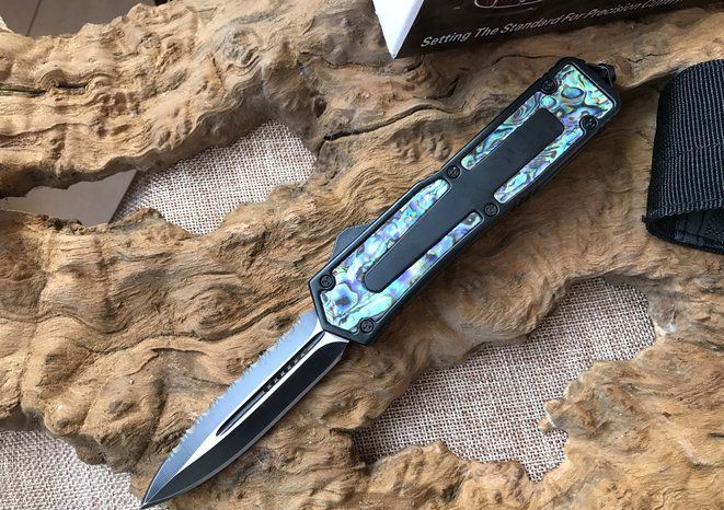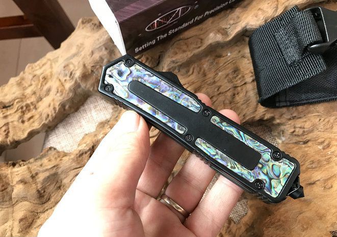 圣甲虫边齿鲍鱼壳珍藏版直跳刀 开启长度:22CM 合起长度:13.5CM 刃 厚:0.3CM 硬 度:57 HRC 刃 材:440c 表 面:发黑 把 手:航空铝合金+鲍鱼壳 净 重:220克(整刀) 毛 重:300克(含包装物) 开 合:双动作,直推开关,自动弹出和收回(刀头比较牢固,只有很轻微的摇动) 包 装:耐磨专用战术尼龙套 口袋刀夹:弹簧刀夹