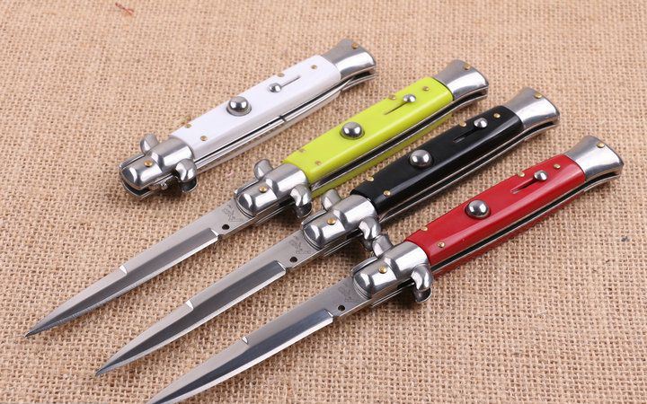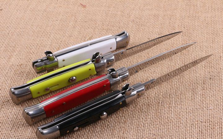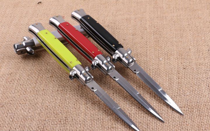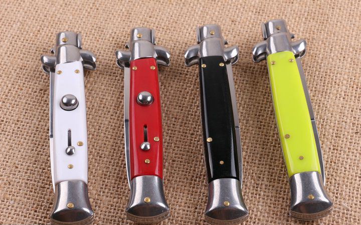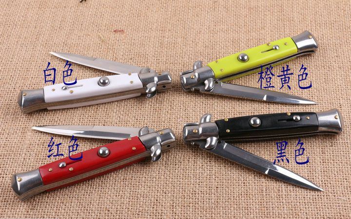 四色9寸意大利黑守党侧跳刀 全 长:22.8cm 刃 长:10cm 柄 长:13cm 刃 宽:1.0cm(最宽处) 刃 厚:2.7mm 刃 材:440 硬 度:56HRC 刀 柄:亚克力 表 面:镜光 开刀方式:自动横出