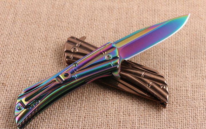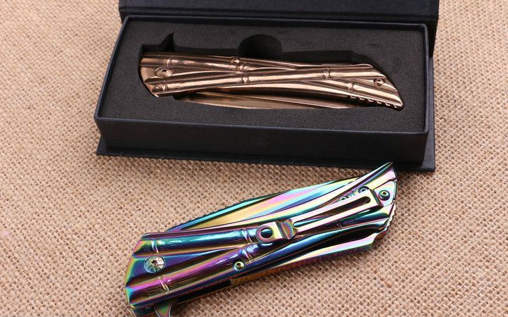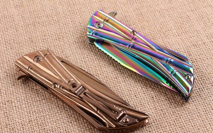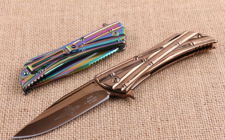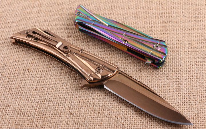 微技术终结者两色折刀 全长;22.2cm 刃长:9.5cm 柄长:12.8cm 刃厚:0.39cm 刃宽:2.8cm 刃材:5CR15MOV 柄材:全钢片 硬度:57HRC 净重:260克(含包装) 锁定:线锁 表面处:钛金色+彩钛两款任选,下单注明
