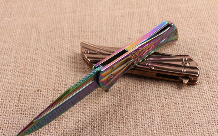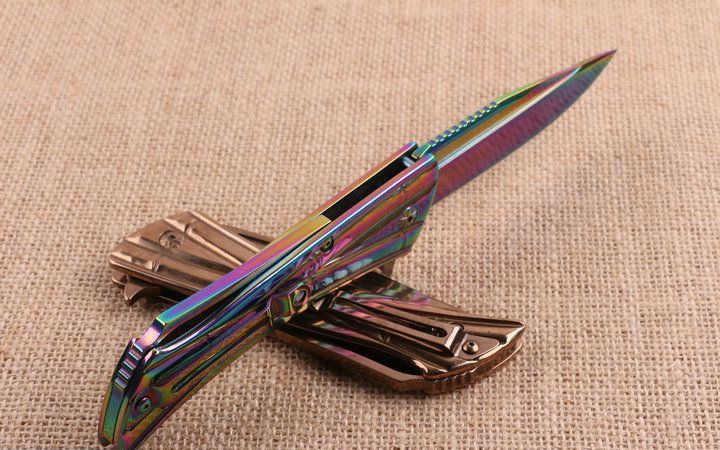 微技术终结者两色折刀 全长;22.2cm 刃长:9.5cm 柄长:12.8cm 刃厚:0.39cm 刃宽:2.8cm 刃材:5CR15MOV 柄材:全钢片 硬度:57HRC 净重:260克(含包装) 锁定:线锁 表面处:钛金色+彩钛两款任选,下单注明 其他:原厂黑盒
