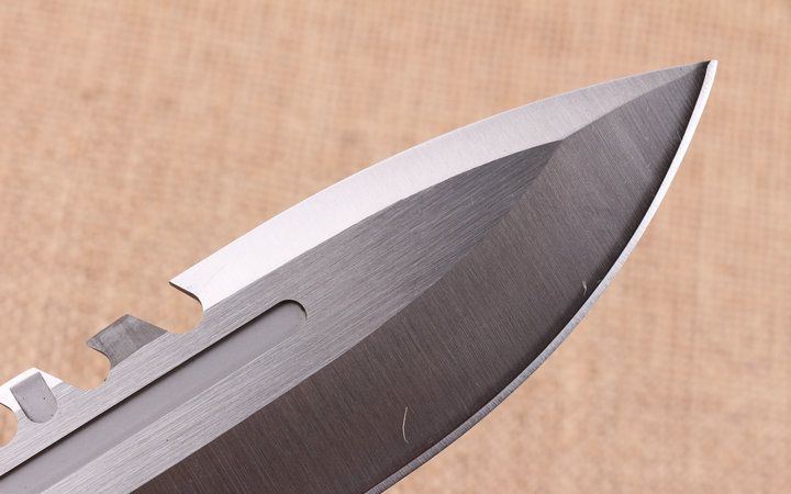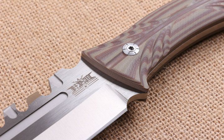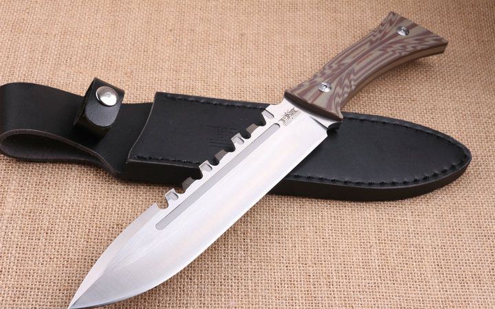 野战狼美式战术刀尖头 全 长:34.3cm 刃 长:210cm 柄 长:12.3cm 刃 宽:4.4cm 刃 厚:5.5mm 刃 材:8CR18MOV 重 量:926g(含包装) 硬 度: 58HRC 表 面:拉丝+沙光。 柄 材:刀身一体龙骨,黑色G10 锁 型:直锁 其 他:礼品盒+皮套