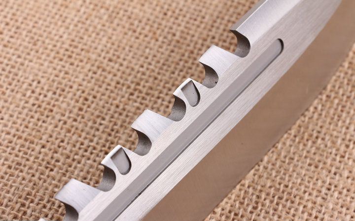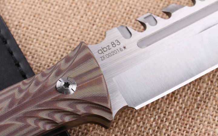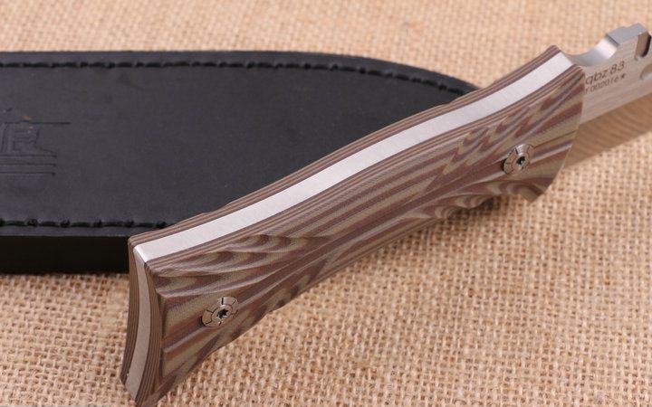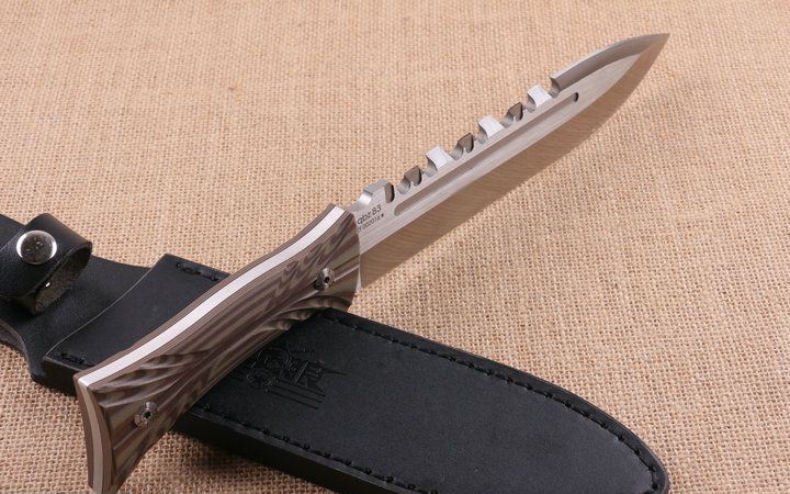 全 长:34.3cm 刃 长:210cm 柄 长:12.3cm 刃 宽:4.4cm 刃 厚:5.5mm 刃 材:8CR18MOV 重 量:926g(含包装) 硬 度: 58HRC 表 面:拉丝+沙光。 柄 材:刀身一体龙骨,黑色G10 锁 型:直锁 其 他:礼品盒+皮套