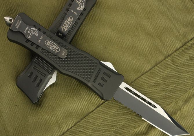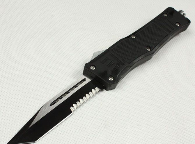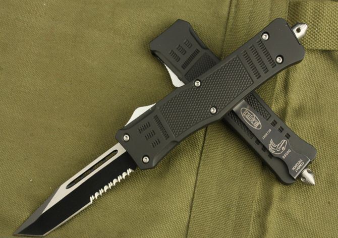 微技术A161方头伤齿龙半齿直跳刀 全 长: 23.5cm (含尾锥长度) 刃 长: 9.5cm 刃 厚: 2mm 刃 材: 440 硬 度: 58HRC 刀净重:258克 总重量: 400克(含包装物) 表 面: 黑钛(刀刃) 柄 材: 锌铝合金 刀 鞘: 尼龙 锁 闭: 弹簧直出