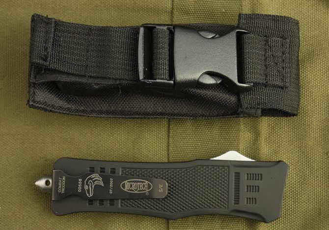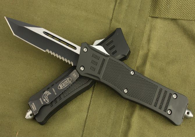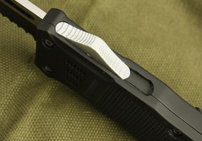 微技术A161方头伤齿龙半齿直跳刀 全 长: 23.5cm (含尾锥长度) 刃 长: 9.5cm 刃 厚: 2mm 刃 材: 440 硬 度: 58HRC 刀净重:258克 总重量: 400克(含包装物) 表 面: 黑钛(刀刃) 柄 材: 锌铝合金 刀 鞘: 尼龙 锁 闭: 弹簧直出 补充说明:直出弹簧刀的点头现象得到了很好的控制,出刀轻而快!手感好!