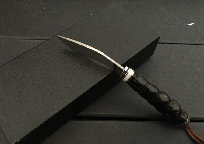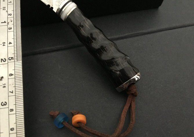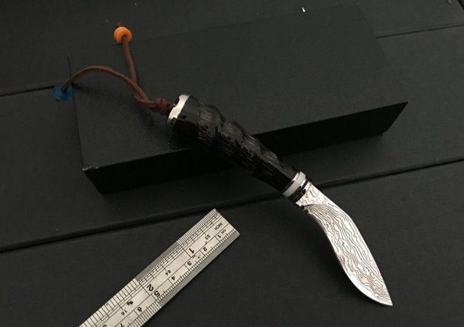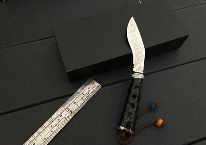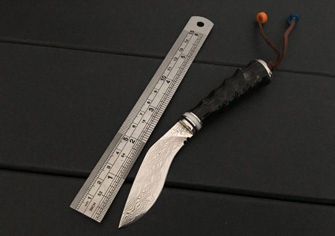 迷你尼泊尔小狗腿刀 全 长:15.5cm 刃 长:6cm 刃 宽:2.5cm 刃 厚:0.3cm 刃 材:5Cr13 硬 度:57HRC 毛 重:120g(含皮套、彩盒) 表 面:大马士革纹 柄 长:7cm