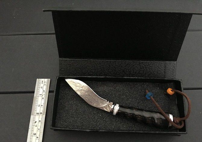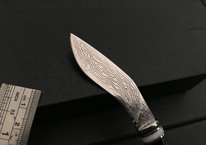 迷你尼泊尔小狗腿刀 全 长:15.5cm 刃 长:6cm 刃 宽:2.5cm 刃 厚:0.3cm 刃 材:5Cr13 硬 度:57HRC 毛 重:120g(含皮套、彩盒) 表 面:大马士革纹 柄 长:7cm 备 注:超锋利+礼盒
