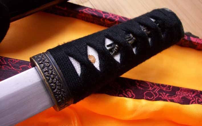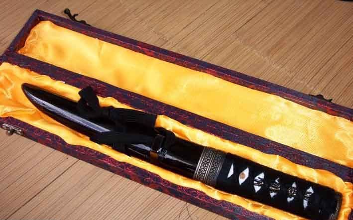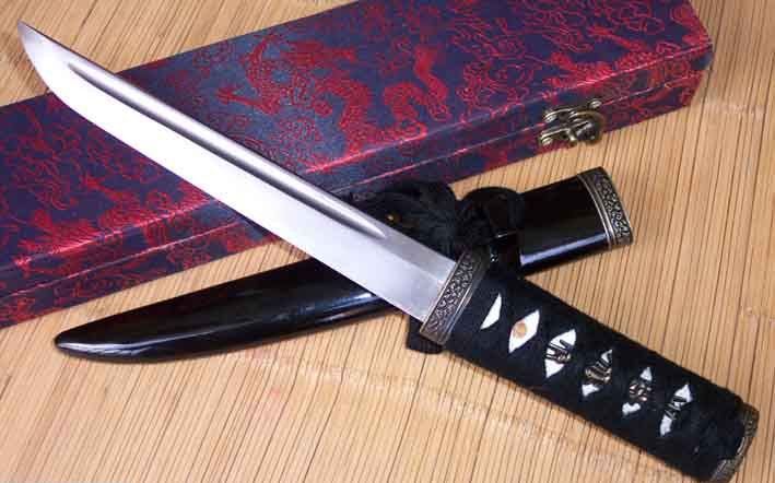 日本武士切腹刀 全长 (CM):35 刃长 (CM):21.5 柄长 (CM):13.5 刃宽 (CM):2.8 刃厚 (CM):0.7 重量(G):400 刃区硬度(HRC):58-60 刀身处理:十道手工研磨,横手做出. 锻造工艺:高碳钢锻打 刃纹: 无 刃材:高碳钢 柄型:直柄形 柄材:珍珠鲨鱼皮 鞘材:青皮木 附带:棉质刀袋,高档锦盒 备注:手工产品可能存在少许误差