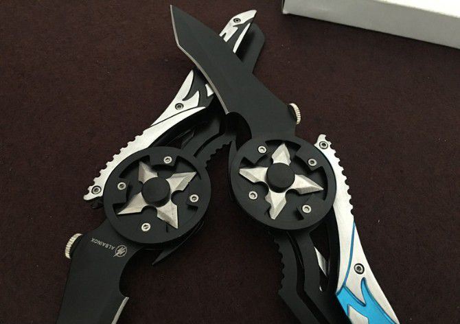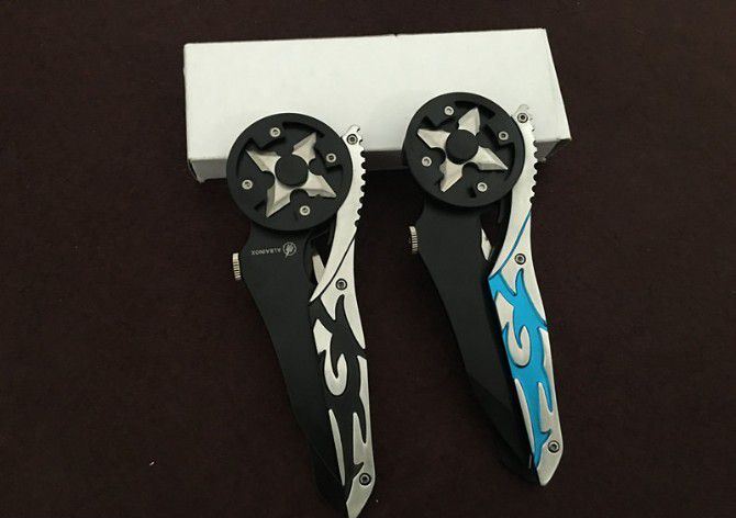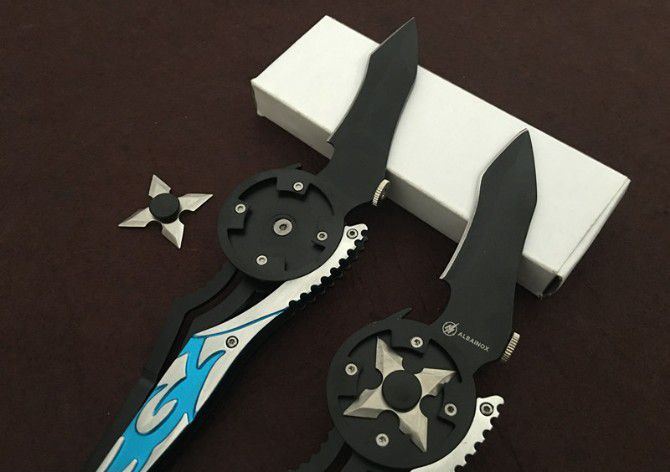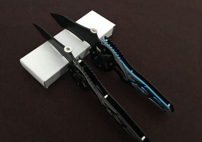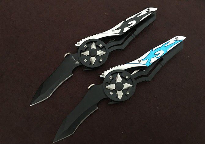 火焰飞镖折刀(黑、蓝) 全 长:22cm 刃 长:7cm 柄 长:13.5cm 刃 宽:2.5cm 刃 厚:0.3cm 刃 材:3Cr13Mov 重 量:150g (含包装) 硬 度:56HRC 表 面:发黑 柄 材:钢+铝柄 锁 闭:线锁