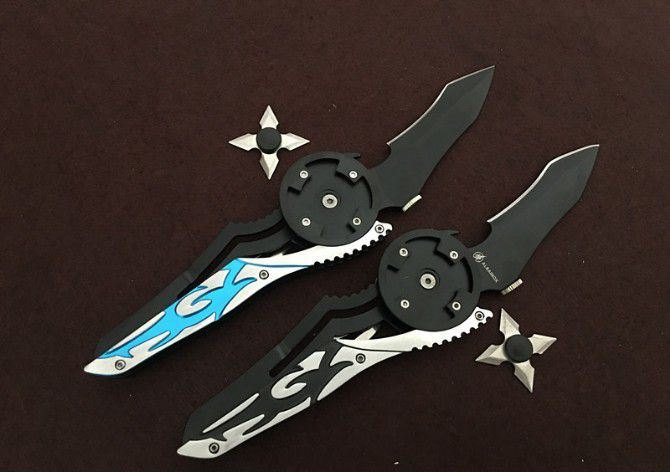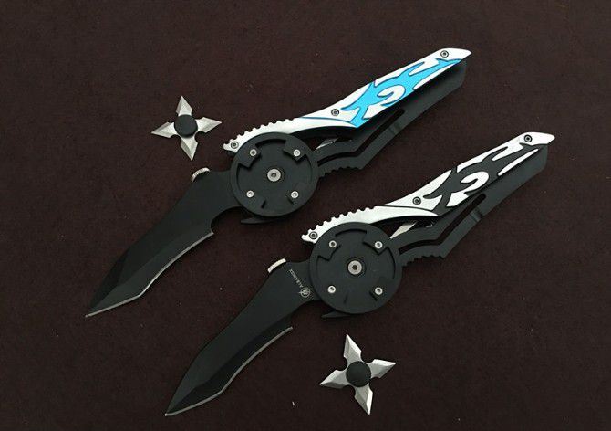 火焰飞镖折刀(黑、蓝) 全 长:22cm 刃 长:7cm 柄 长:13.5cm 刃 宽:2.5cm 刃 厚:0.3cm 刃 材:3Cr13Mov 重 量:150g (含包装) 硬 度:56HRC 表 面:发黑 柄 材:钢+铝柄 锁 闭:线锁 其 他:白纸盒