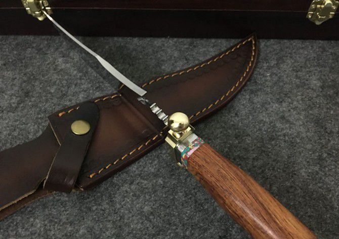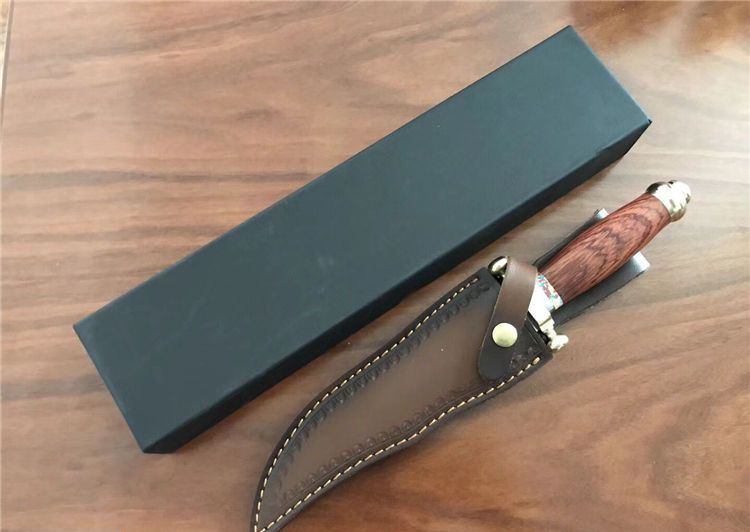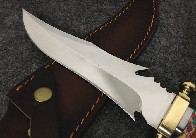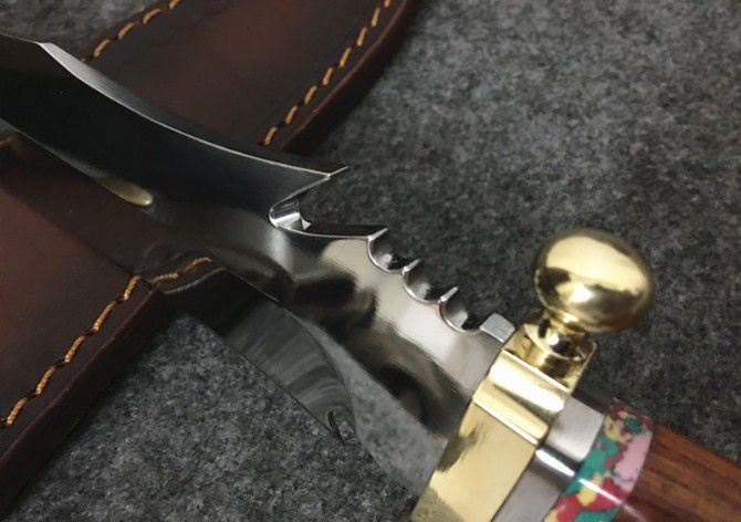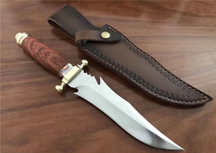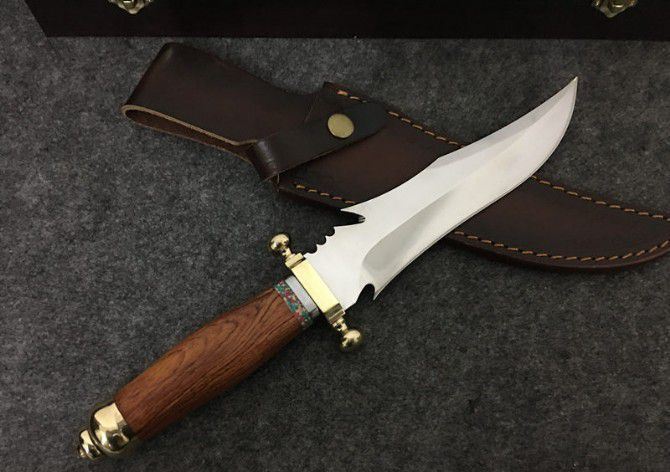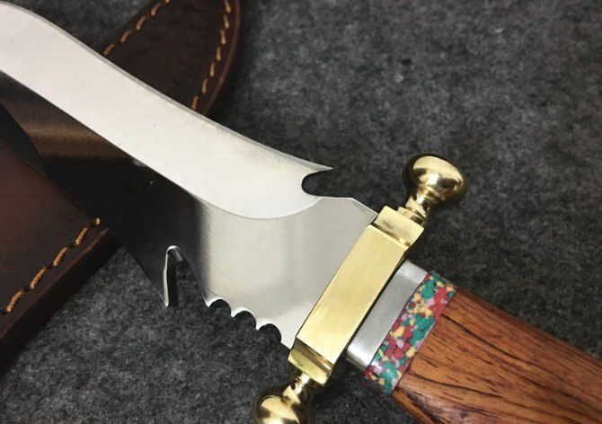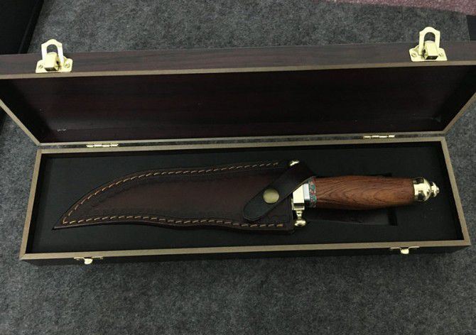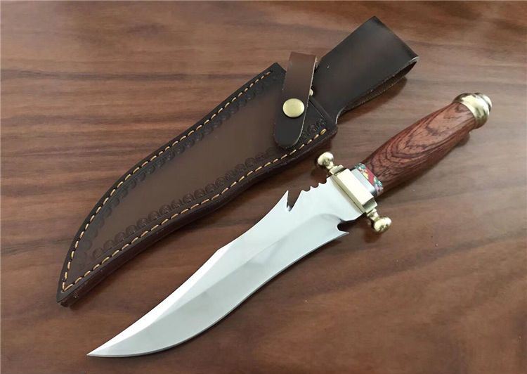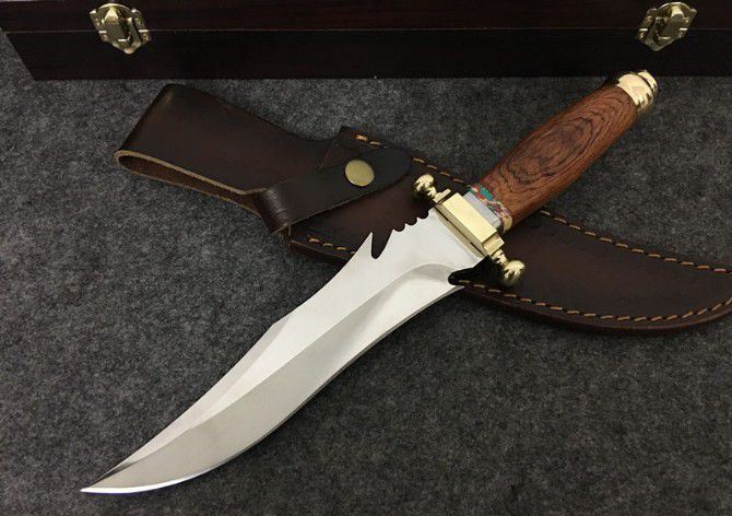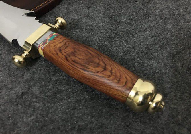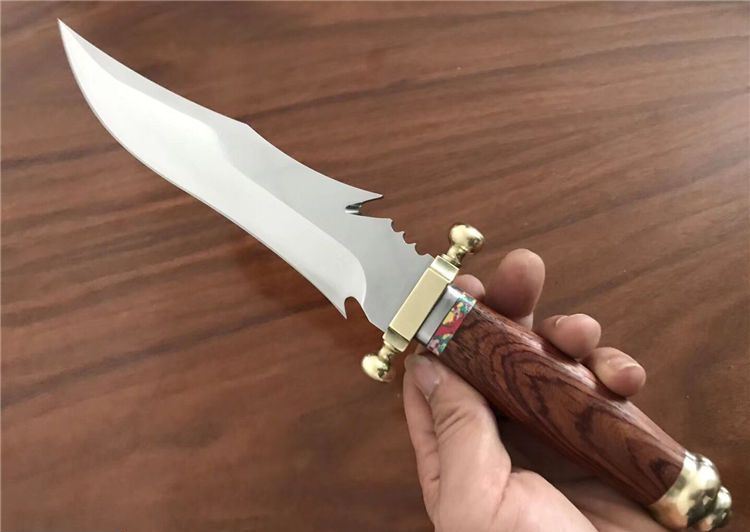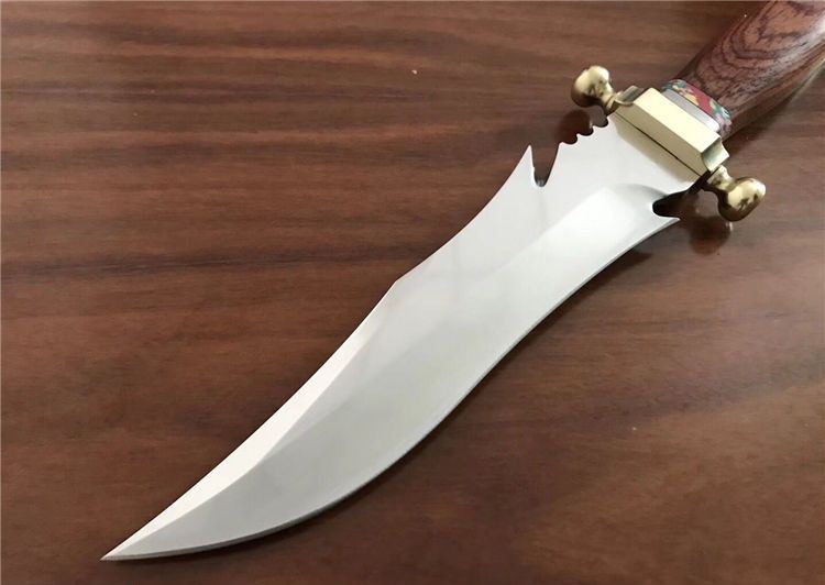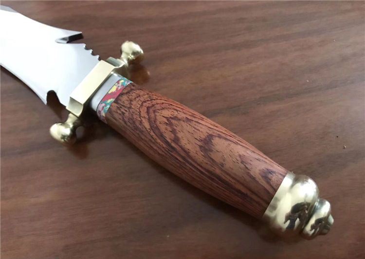 敢死队荒原骑兵刀 全 长: 32cm 刃 长: 17cm 刃 宽: 4.5cm(最宽处) 柄 长: 12cm 硬 度: 59HRC 刃 厚: 0.5cm 重 量: 670克(含包装) 表 面: 镜光 刃 材: 7Cr17 柄 材: 铜+木