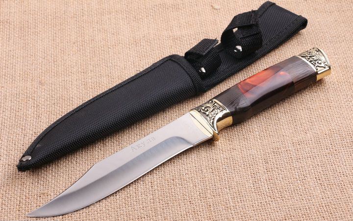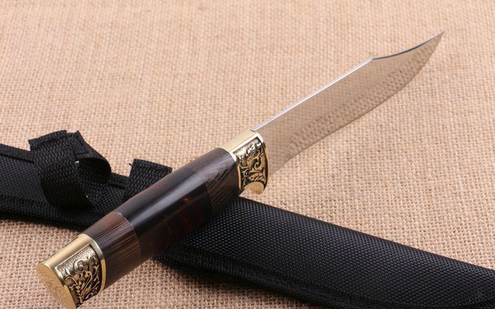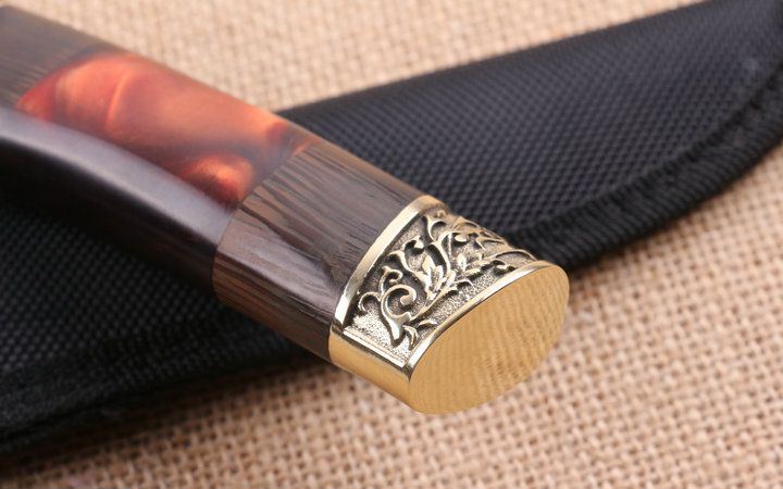 铜头FB270木柄直刀 全长:38.2cm 刃长:15.6cm 柄长:12.6cm 刃厚:0.25cm 刃宽:3.2cm 刃材:5CR15MOV 柄材:雕花铜头+彩木+聚脂 硬度:57HRC 净重:240克(含包装) 锁定:直锁 表面处:沙光