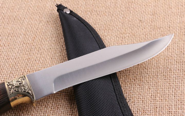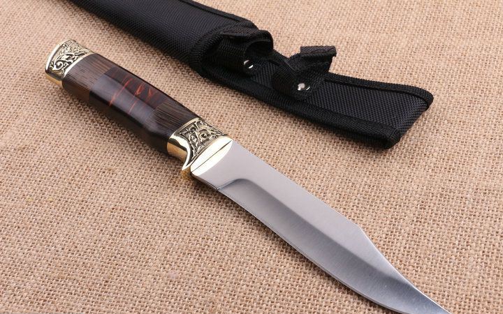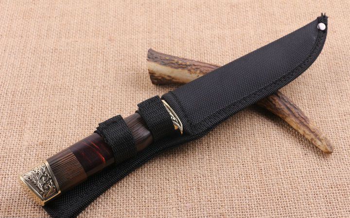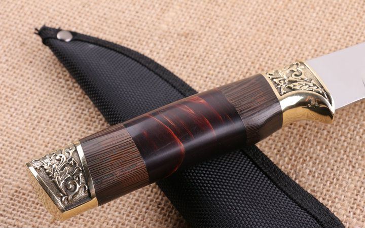 铜头FB270木柄直刀 全长:38.2cm 刃长:15.6cm 柄长:12.6cm 刃厚:0.25cm 刃宽:3.2cm 刃材:5CR15MOV 柄材:雕花铜头+彩木+聚脂 硬度:57HRC 净重:240克(含包装) 锁定:直锁 表面处:沙光 其他:原厂尼龙套