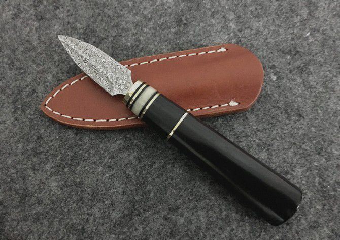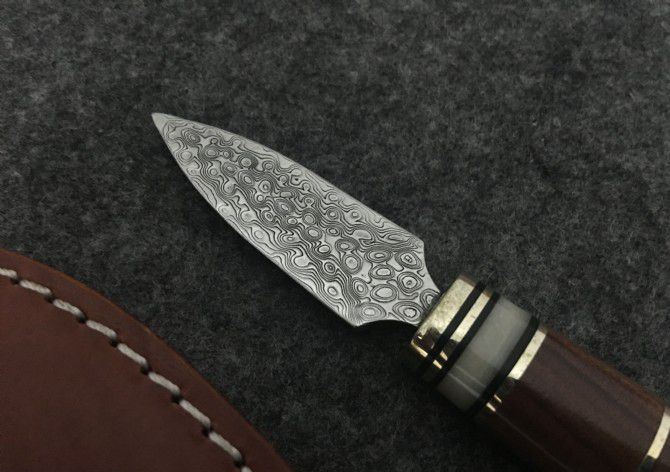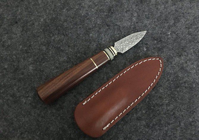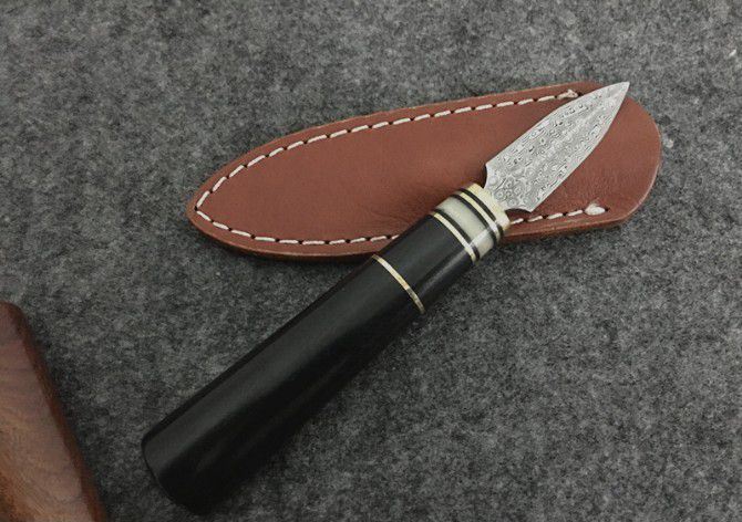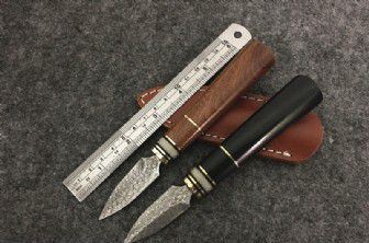 大马士革翠珍茶叶刀 全 长:15cm 刃 长:4.7cm 柄 长:10.3cm 刃 宽:1.5cm 刃 厚:1mm 刃 材:大马士革 重 量:100g(含包装) 硬 度:58HRC 表 面:大马士革原色 柄 材:铜头+兽骨+檀木